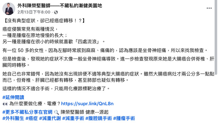 根據《健康2.0》、《中時新聞網》報導,敏盛綜合醫院微創手術中心執行長、一般外科醫師陳榮堅在臉書發文寫道,這名患者的大腸癌原發腫瘤僅約2公分大小,但癌細胞卻已經擴散至脊椎、肝臟及肺部。由於屬於多處轉移的狀況,已經不適合採用手術治療,只能透過化療與標靶治療來控制病情進展。