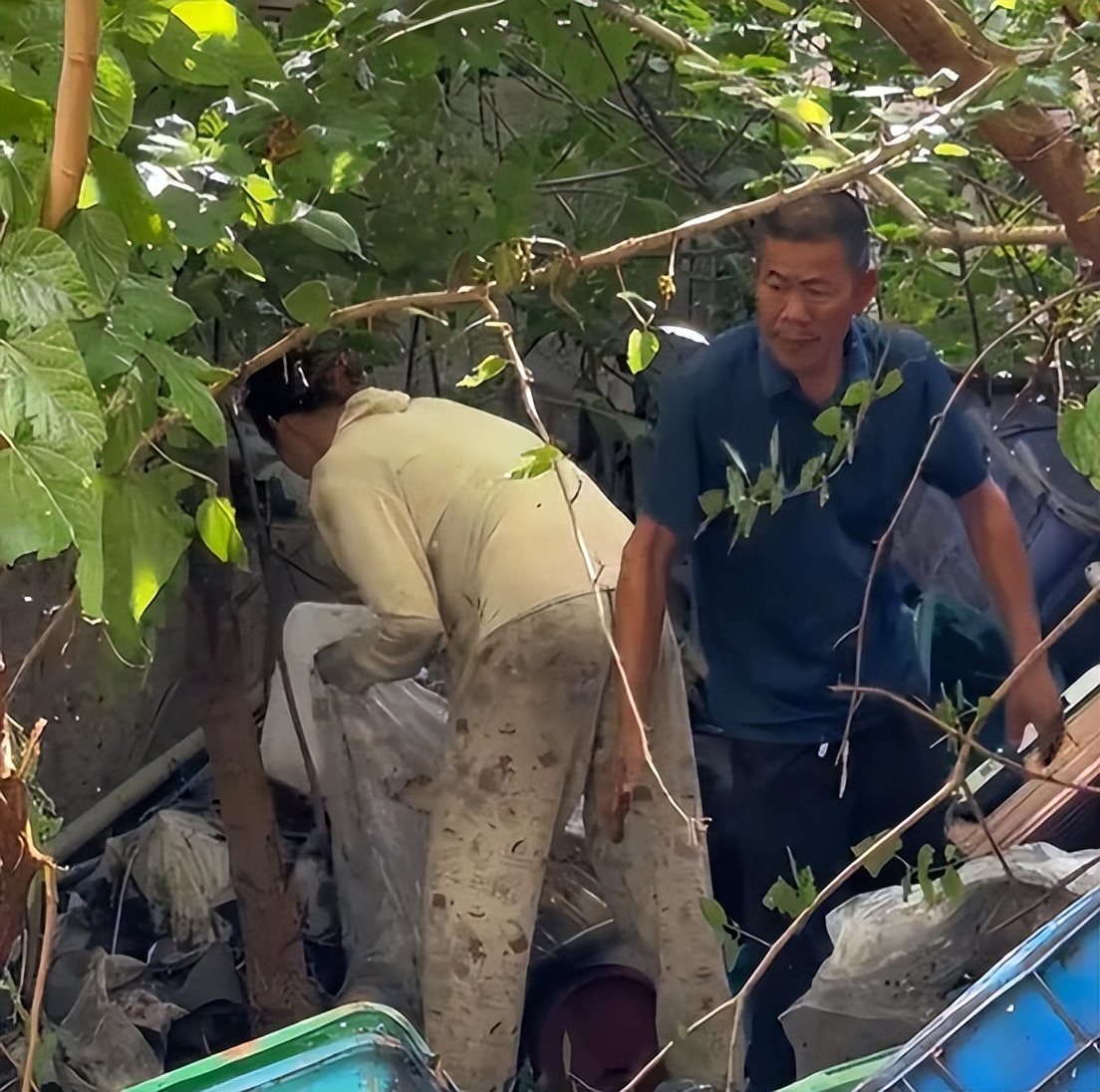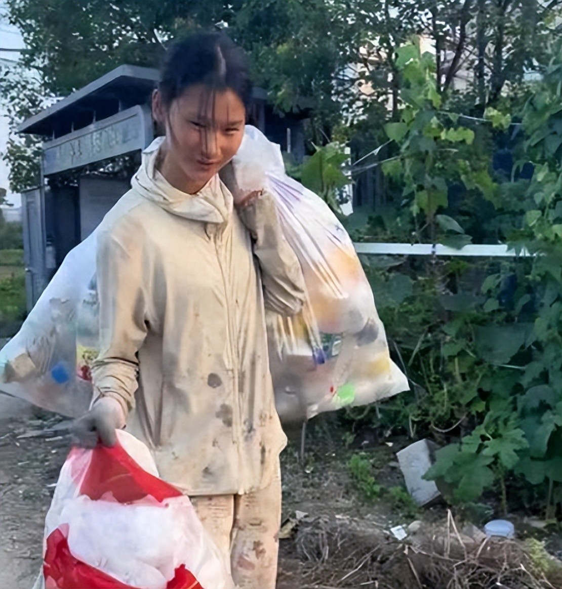 畫面裡,她穿著寬大的舊工裝,戴著手套麻利的撿著各種廢品。