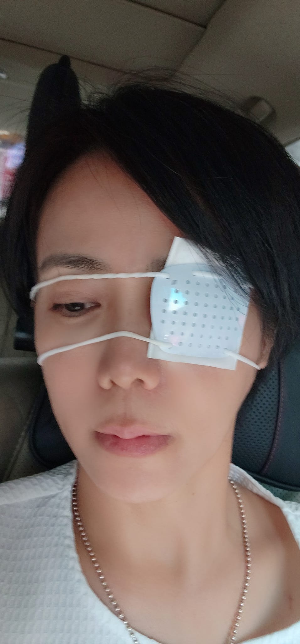拆下眼罩,她不禁自嘲:「腫到像割失敗的雙眼皮!」然而這情況並非第一次發生,2019年同一隻眼睛也遭兒子戳傷,分享當時照片,幾乎睜不開眼,表情相當痛苦!