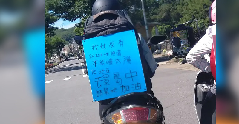 日前就有一位網友在臉書「爆廢公社二館」發文,提到自己在上班途中看到兩位正在環島的帥哥,仔細一看兩個人的背後都各自揹著一個板子,左邊騎士背後板子寫道「環島中~尋找正在走失的女友!」很明顯是想要透過這樣的方式來脫單XD