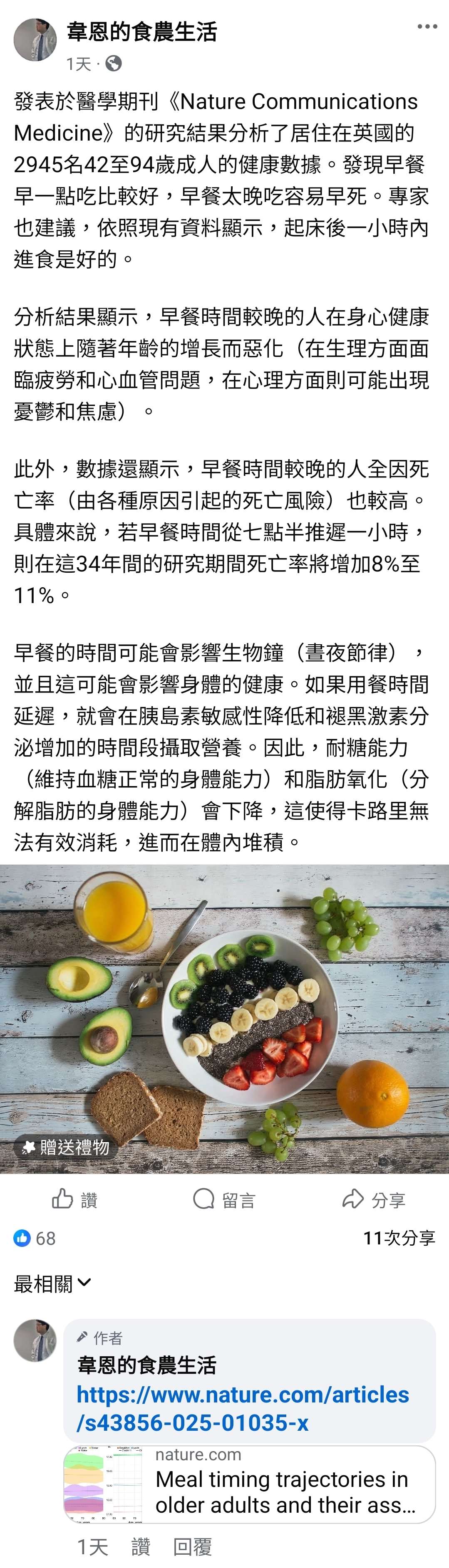 畢業於台大食品科技研究所、長期分享保健營養及食安資訊的《韋恩的食農生活》專欄作家,引用了《Nature Communications Medicine》期刊上的一篇報告。該研究針對2945位年齡介於42至94歲的英國民眾進行數據追蹤,結果顯示「若早餐時段較晚,隨著年紀增長,身心健康狀況會逐漸走下坡,生理上可能出現疲勞感及心血管疾病,心理層面則容易產生焦慮與憂鬱情緒。」