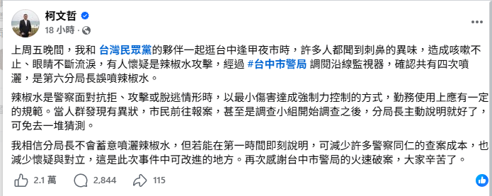 快訊/大逆轉!柯文哲遭噴辣椒水「兇手竟然是他」 Elmo 2026-04-21 檢舉 豈料下午案情急轉直下,真相曝光後所有人都傻眼了。原來當天是分局長周俊銘在測試有問題的辣椒水噴霧器,因為操作失誤才導致這場誤會。網友得知後紛紛留言:「這也太瞎了吧」、「警察自己搞烏龍還讓人誤會」、「分局長出包也是挺扯的」、「難怪查不到可疑人士」、「這劇本根本想不到」。警方依照相關規定將周俊銘記過兩次,並調任非主管職務。圖片來源:《三立新聞網》 Advertisements 圖片來源:柯文哲臉書影片來源:TVBS NEWS資料來源:《TVBS》 Advertisements 回首頁 2/2 Advertisements 猜你會喜歡 快訊/本來在拚連任!知名議員「驚傳過世」 民進黨拍板了!2政壇大將「確定參選市長」 綠營戰將「被爆毒駕判刑」!民進黨火速開鍘:「不予提名...」 編輯精選推薦 More + 45歲本土劇男星「驚曝已婚16年」! 首吐婚姻狀況「愛女是名校學霸」 趕在40歲前閃婚!八點檔女星「宣布嫁給他」 尪驚人身分曝「媒人是柯叔元」 弟成植物人、姊猝逝!玉女歌手「遭前夫設套」騙走娘家房產 「狠斬16年婚姻」近況曝 功德圓滿了!台語歌后「悲曝他離世」享壽95歲 淚喊:去當快樂的神仙吧... 65歲男星獨居暴斃!大咖女星放下恩怨「送前夫最後一程」 昔遭動手6年嘆「死者為大」 最新/賈靜雯深夜慟曝「她已離世」 淚PO合照喊:真的好愛你... 44歲許維恩罹乳癌!醫示警「3日常用品」易致癌:別碰才能保命 22歲愛女病逝!資深男星「走不出喪女痛」留白長髮現身 掛骨灰項鍊「代女做1事」惹淚 最新/3度中風送醫!資深男星爆離婚「斷50年髮妻」 「砸1億淨身出戶」家族爆紛爭 86歲蕭萬長「逆轉肺癌」!秘訣竟是「靠1碗養生湯」每周喝4次:快速清毒素 空窗多年!68歲陳美鳳突羞認「身邊有個他」 40年前就認識「遭男方母親拆散」 晚年隱居台東!68歲名主持失蹤「車內身亡」 伴侶悲曝「死前做1事」:還掛念著我 婚變尪落跑!單親媽「獨扛千萬債養孩」到處躲黑道 「一開口驚艷眾人」熬成台灣歌后 別人對你說謝謝!不要說「不客氣」 教你3種「高情商的回應方式」 送別亡夫3年!丁強遺孀「不投靠美國兒女」 獨留台灣「76歲拒健康檢查」原因曝光 台灣大咖病逝「享壽83歲」!周遊告別式痛哭「認婚內出軌」:兒子很恨我... 離婚11年!洪榮宏愛女結婚「終破冰前妻」 「2爸爸牽她進場」催淚畫面曝 演藝工作不做了?60歲綜藝一哥「被目擊改行開公車」 上路1狀況「遭黃鐙輝狂酸」:在家休息就好 千萬起家厝賣掉了!張秀卿認手頭緊「為女兒月花20萬」 她超爭氣「進軍美國」成台灣之光 台語歌后慟別摯愛!告別式上認「早隱瞞病情」 道歉哭喊:原諒我簽放棄急救 男子吃自助餐「浪費食物」被罰2400元,不吵不鬧付錢離開,老闆慌了:快追回來 85歲失智父身亡!林葉亭突宣布「皈依佛門」 遇大師「開示一番話」忍不住淚崩 15歲兒「睡夢中離世」!本土女星「送愛子火化」求做1事 「PO照圓滿了」:媽媽和你永不分開 一男一女麥地私會「全被拍」!下秒按耐不住「往樹林走」鑽進排水溝 本土劇女星生了!7年前凍卵「終於來到我身邊」 歌手尪嗨喊:生個足球隊