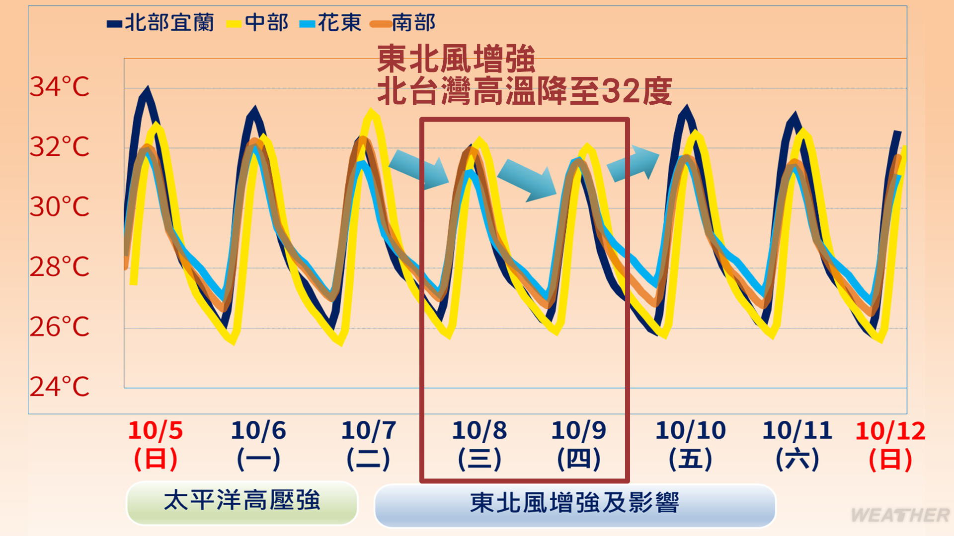 受到颱風外圍環流與東北風共同影響,台北、新北、基隆、宜蘭、花蓮、台東等六縣市將出現較大雨勢。氣象署預報,10月8日至10日期間,迎風面的大台北地區、基隆北海岸、東半部地區以及恆春半島,都有機會出現局部短暫陣雨。