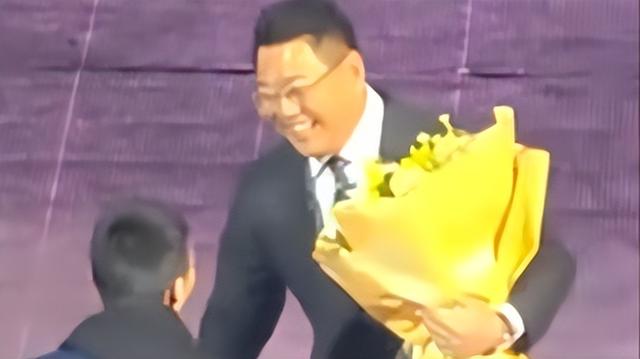 就在西裝男呆愣之際,觀眾席衝出來一個男孩、握住了他的手。一場尷尬迎刃而解,一個高光就此誕生!
