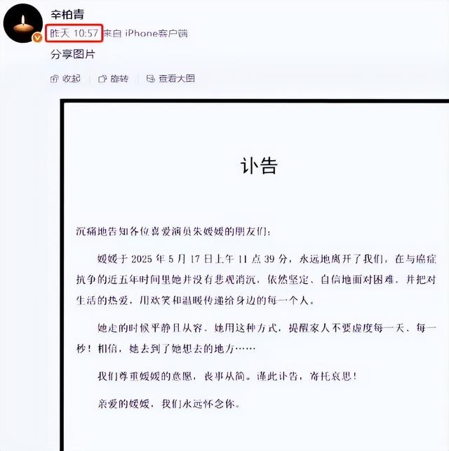 而在朱媛媛離開後,網路上接連曝光了辛柏青的兩個細節,讓大家真真切切感受到了辛柏青有多麼愛朱媛媛!首先要說的,便是辛柏青發布訃告的日期和時間:5月21日上午10點57分。
