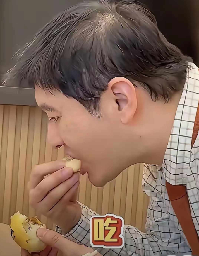 藏藍色的外套,臃腫的黑色褲子,大眼一看還以為是老頭穿搭,端著一碗面吃的香噴噴。