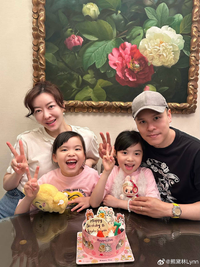 畫面一轉,熊黛林與郭可頌甜蜜同框。照片中,生日蛋糕在她手中,她與老公親密互動,她臉上始終洋溢著幸福的笑容,幸福感直擊人心。郭可頌站在妻子身後,彎腰半蹲配合她的小動作,每個細節都展現出他的寵愛,甜蜜指數爆棚。其他照片中,夫妻倆也帶著女兒們一同亮相,雙胞胎寶貝這次換了不同髮型,穿著同款不同色系的旗袍,俏麗可愛。乍看之下,兩個寶貝長高不少,姊姊依舊漂亮動人,妹妹也日漸可愛,圓潤的小臉更添萌感。更可愛的是,姊妹倆都開始換牙了,照片中露出的豁牙模樣萌態十足,惹人喜愛。