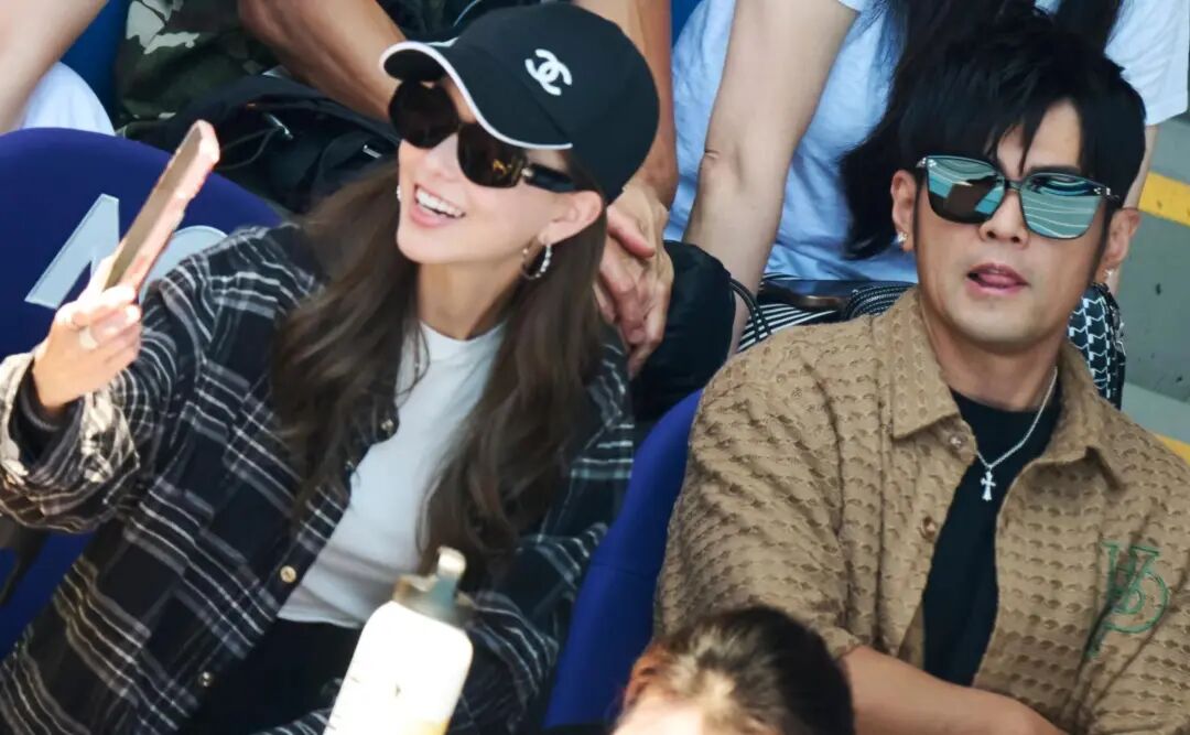 周杰倫和昆凌的穿搭一看就是來「輕鬆看球」的:帽子、墨鏡、休閑襯衫,沒走紅毯那套,但細節又很講究。兩個人坐著不吵不鬧,眼睛盯著場內,偶爾轉頭跟朋友聊兩句,嘴角帶笑,那種「真粉絲來打卡」的狀態很明顯。