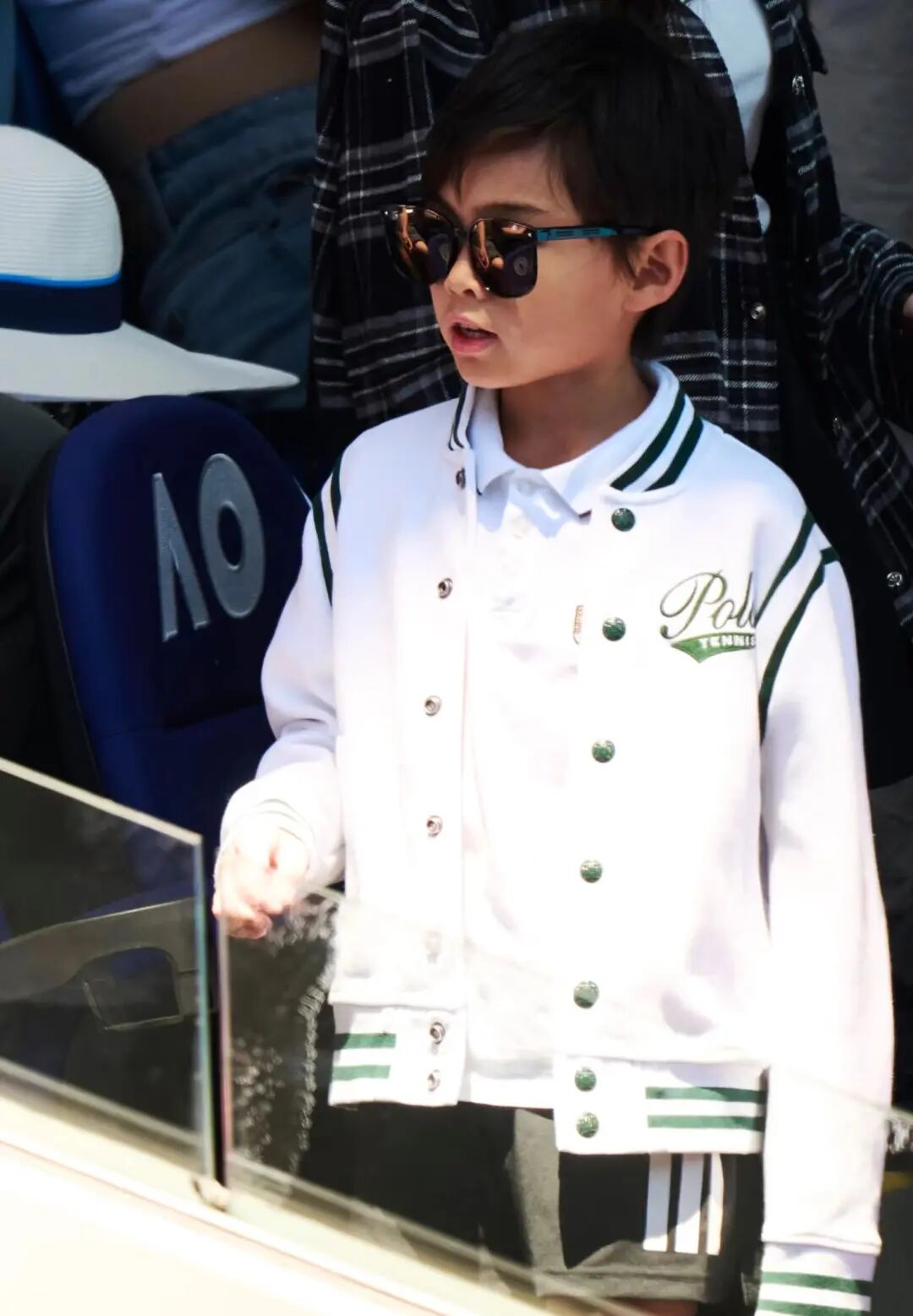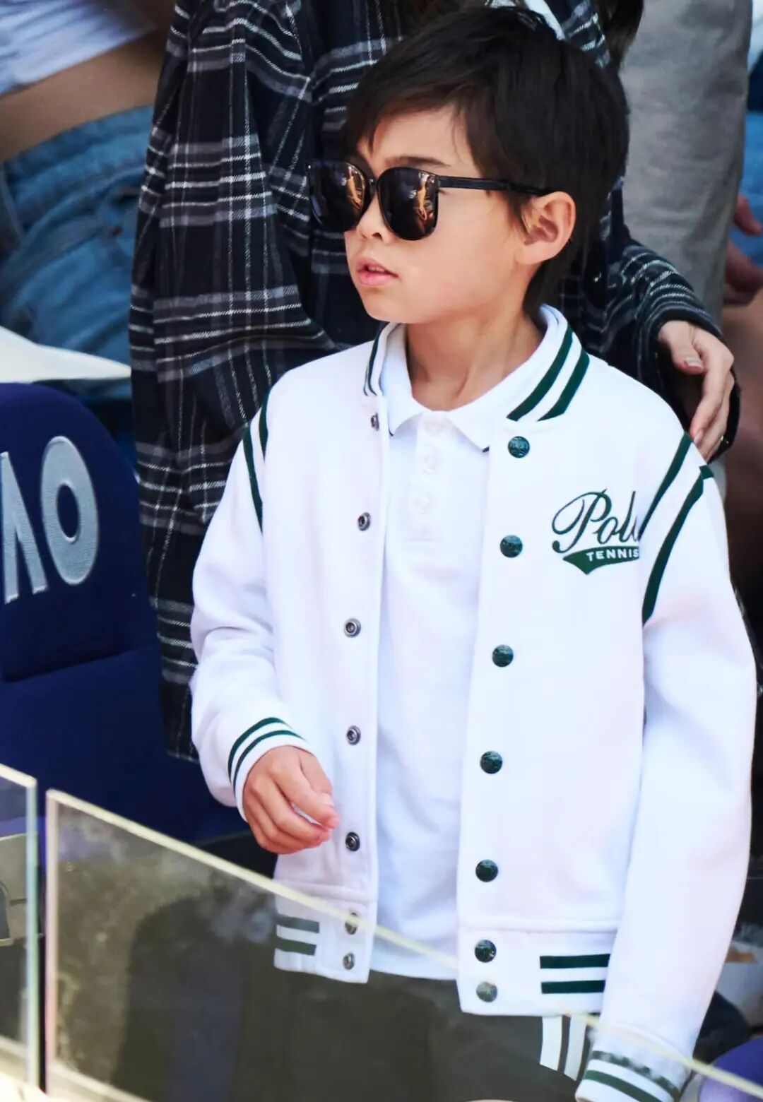 他那身白綠拼色夾克不花哨,但很乾凈,墨鏡一戴,氣場像「迷你酷哥」。你說他在裝嗎?不,他是真的認真。看球時肩膀綳著,頭跟著球路輕輕移動,關鍵時還會抿嘴。