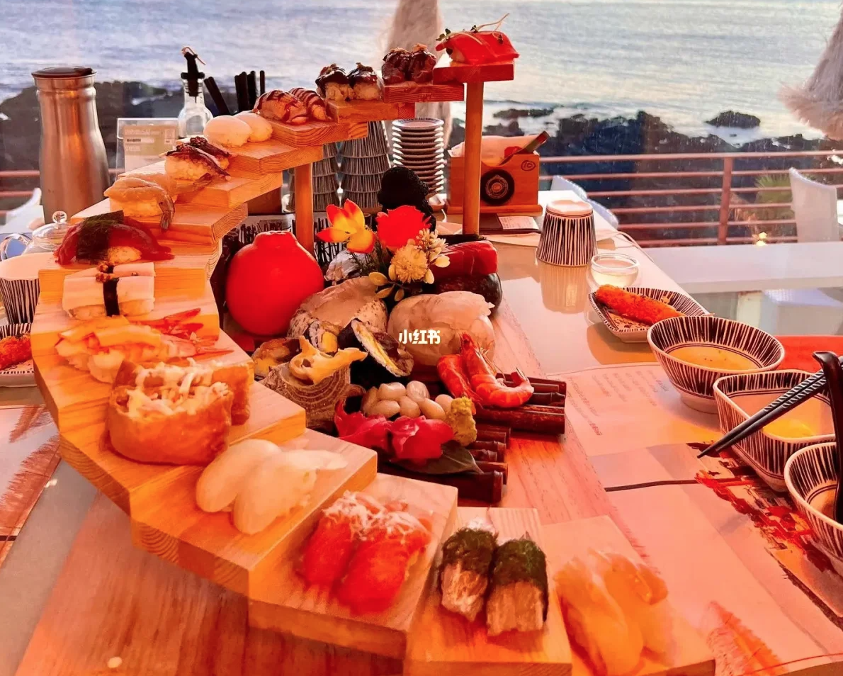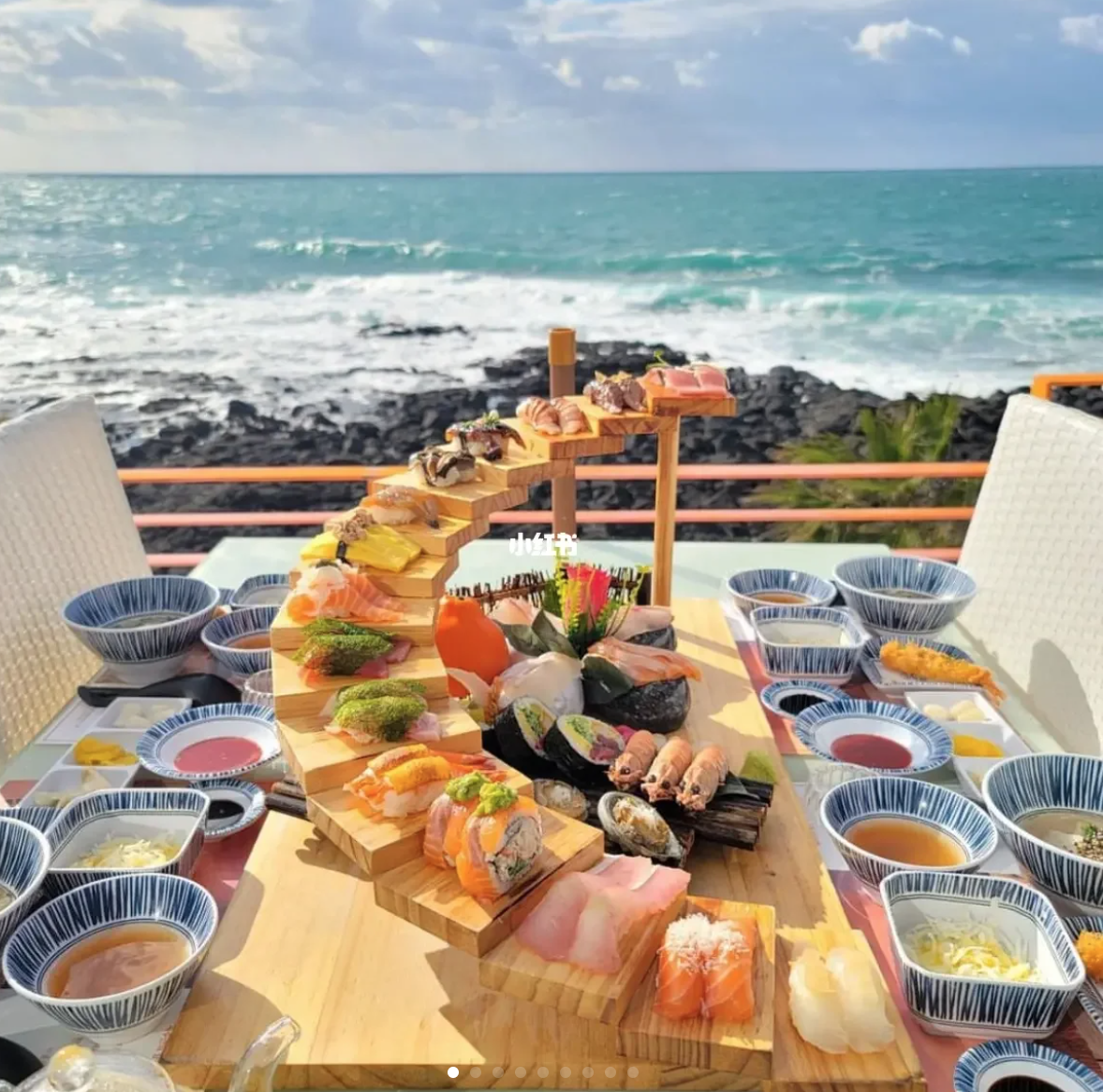 而這裡最有特色的除了濟州島風光外,另外當地最具特色的套餐就是這個「天國階梯壽司盤」啦!當服務員一端上桌整個氣勢滿滿,很多網美們都會想跟這盤超豐盛壽司盤拍照!