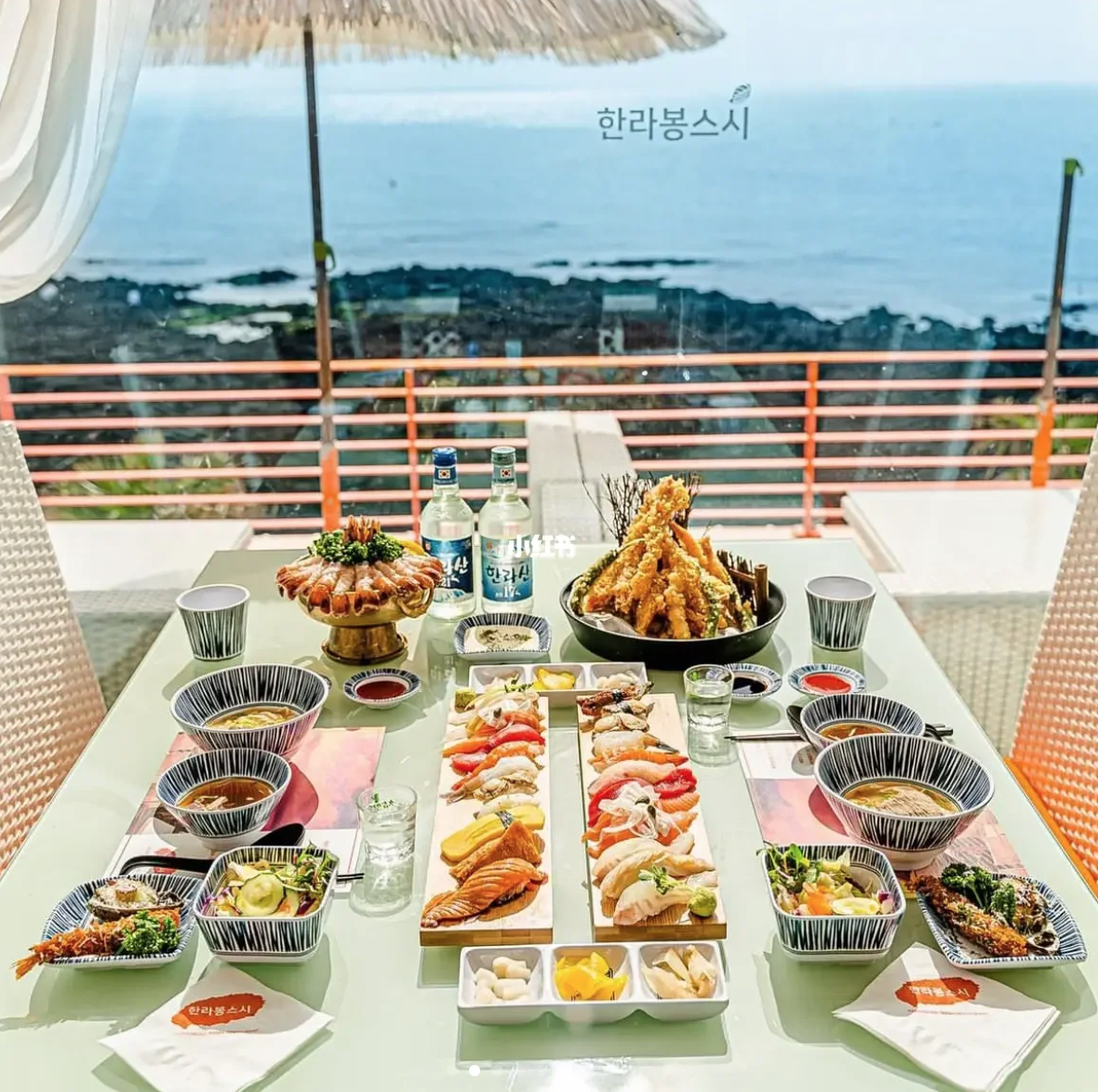 這間海景壽司店「한라봉스시」在IG上特別有名,店內裝潢非常簡潔乾淨,加上地址在靠海的濟州島沿岸,坐在餐廳裡面就可以欣賞絕佳的海岸風景,是許多遊客都會想來的地方。