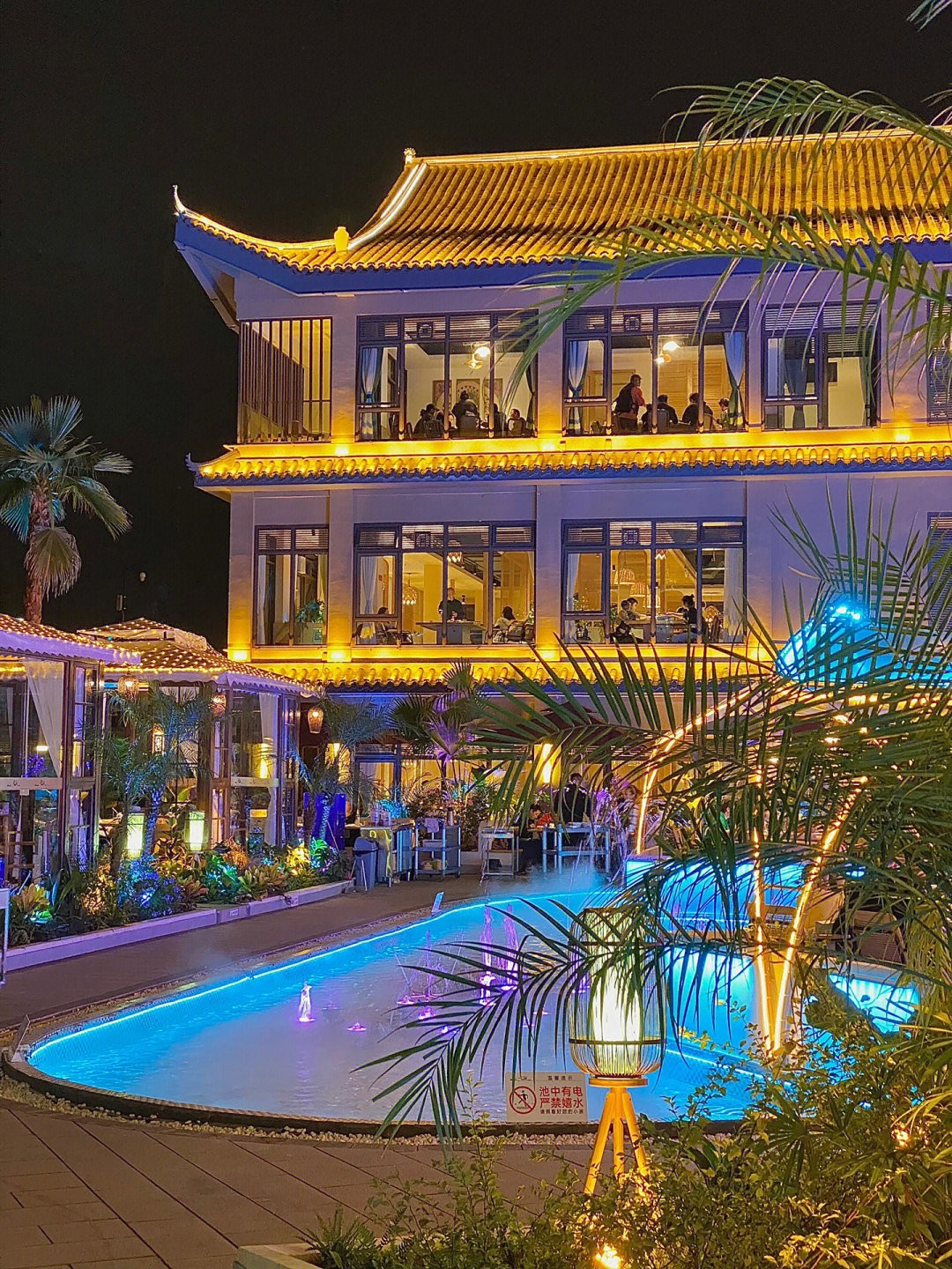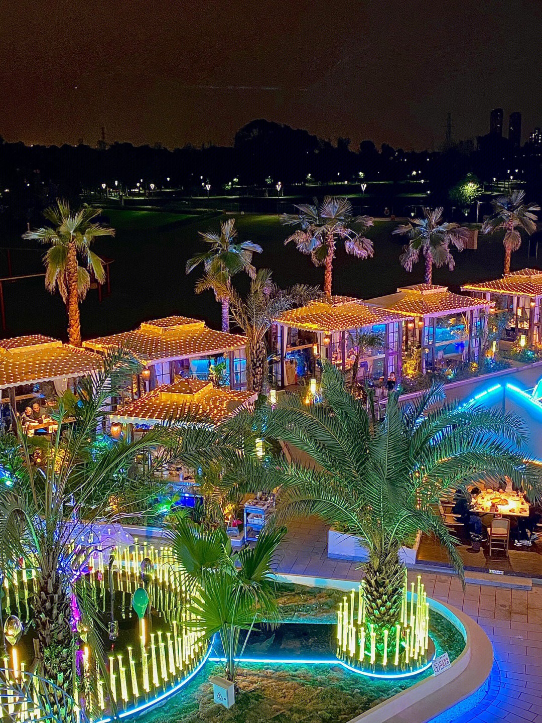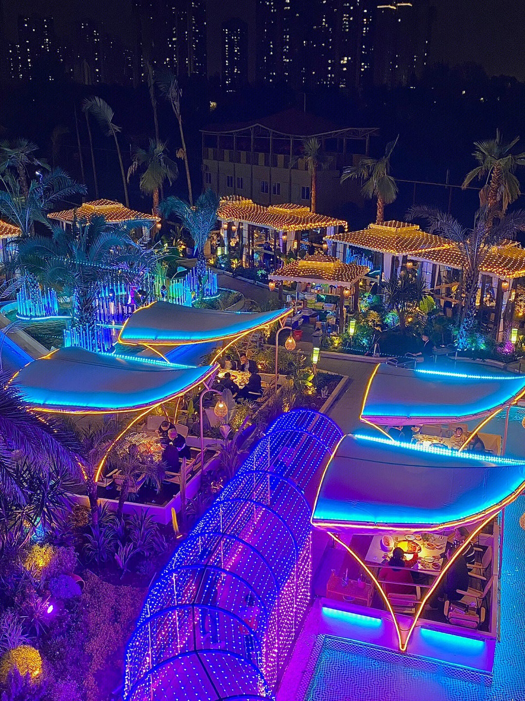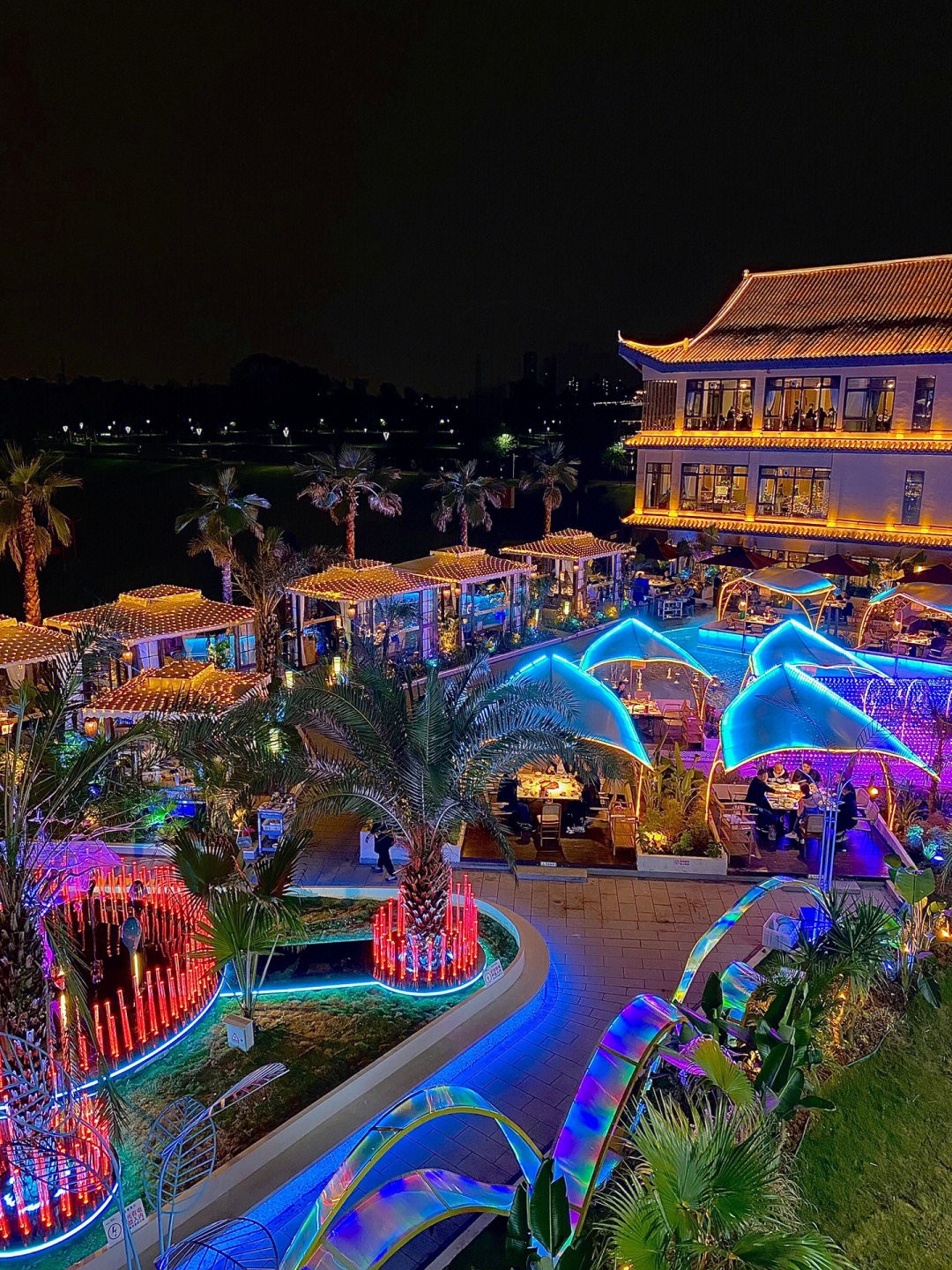主要餐廳建築是採宮廟設計,每到了晚上看上去有點像是神隱少女的湯屋場景,整個餐廳更是燈火通明,五光十色的現代感霓虹燈,加上隨處可見的椰林湖水,每間戶外座位更是設計得像小船一般,大家可以邊吃火鍋邊看夜景,不管是朋友聚餐、情侶約會都超浪漫~