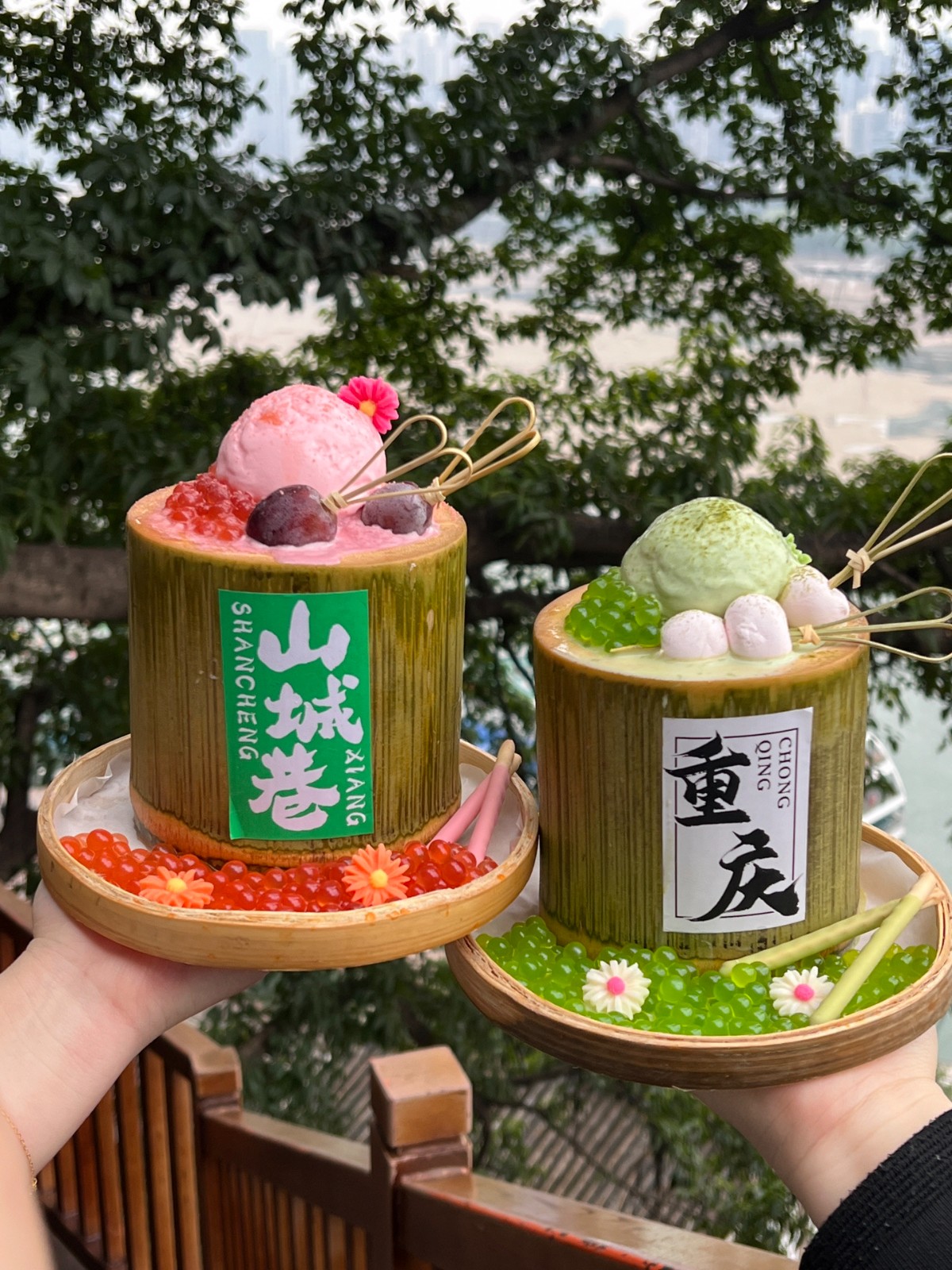另外這間火鍋店的甜點也超有名!流心的雙蛋黃湯圓麻薯上放著兩個可愛的蛋黃冰湯圓,軟Q麻薯配上奧利奧碎太好吃了~另外還有用竹筒裝的冰淇淋奶茶,看起來超有夏日風情!