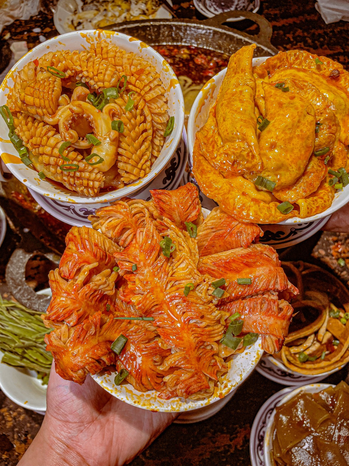 這裡最知名的就是這圈36宮格火鍋料了!整齊排列的小碗裡裝了各式各樣的蔬菜、菇類、肉片等火鍋料,還有經典的內臟類如黃喉、毛肚、鴨腸、腰片等,放在一起看起來超壯觀~