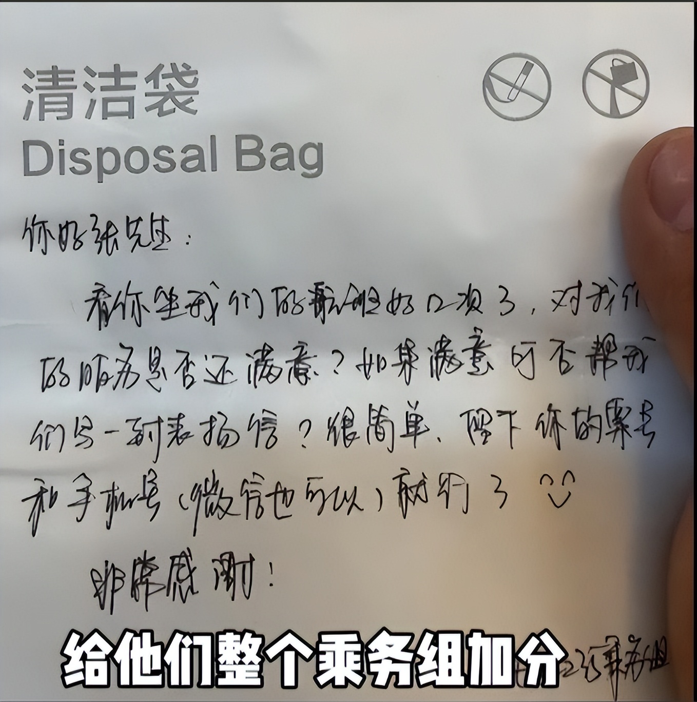 當時的她想到了一個好辦法,她留下紙條表示飛機上正在做乘客的滿意度問卷,希望張教官幫自己一下。