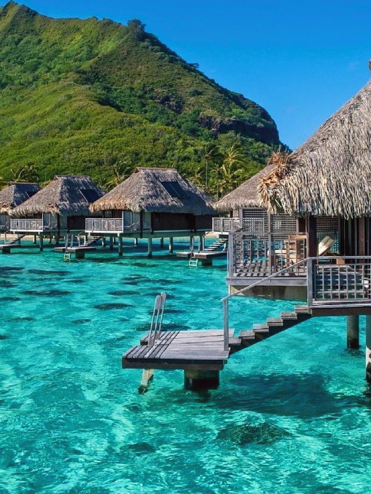 置身夢幻的藍!蔚藍海洋中「水上茅草度假屋」度假感滿滿 傍晚時分「七彩晚霞映照海面」露天座位超讚