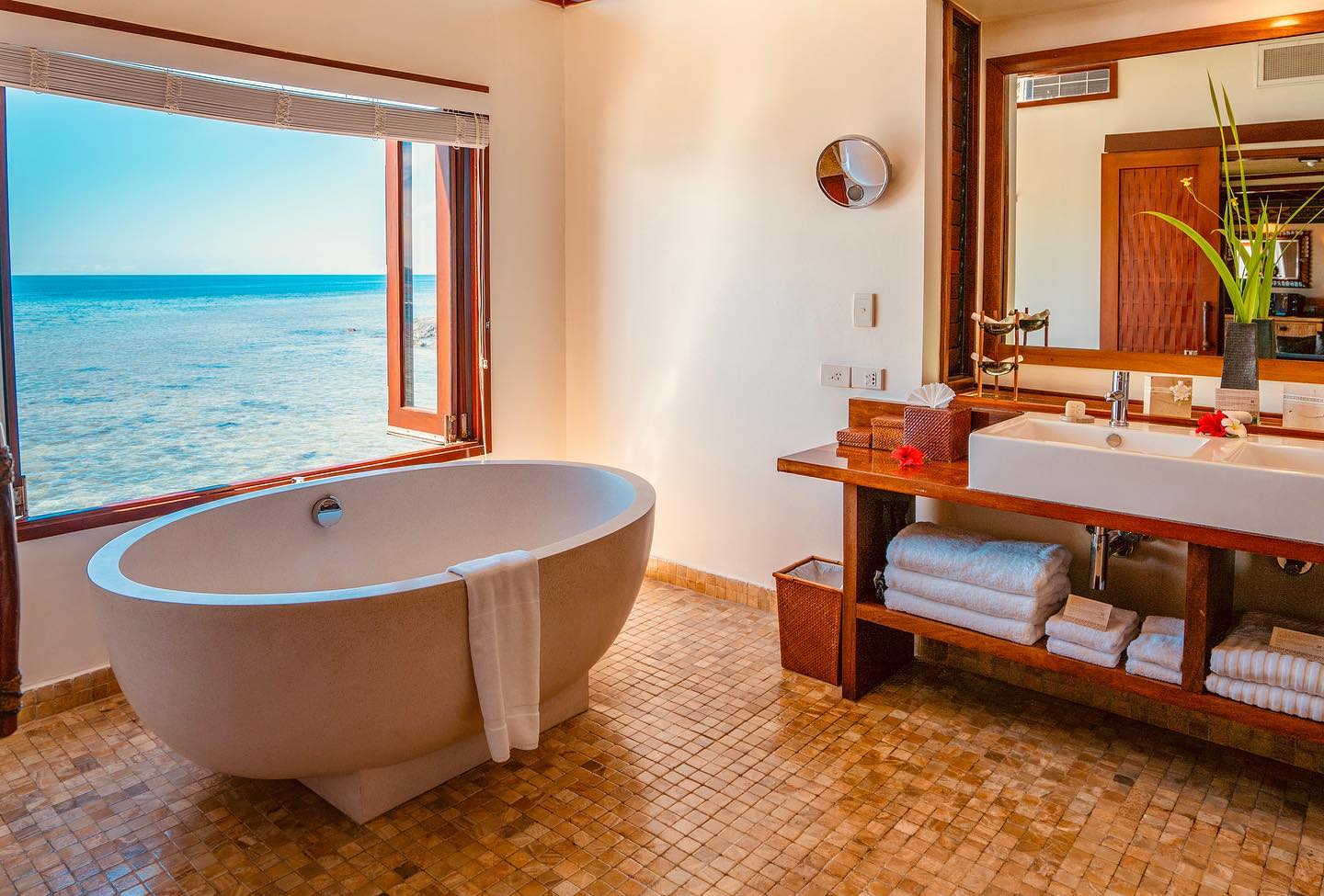 屋內的裝潢充滿了度假風的木質風元素,挑高屋頂讓室內看起來寬敞舒適,緊鄰海洋的浴室更是能邊泡澡邊賞海景,小陽台也放有桌椅,可以在絕佳視野的位置邊放空邊欣賞夢幻景色~