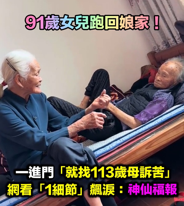 91歲女兒回娘家「找113歲母訴苦」!網一看「互動1細節」飆淚:神仙福報 中距離神射手 2026-03-18 檢舉 網友們看到這對高齡母女的溫馨互動,紛紛獻上祝福,「這是人間最奢侈的幸福,年紀再大只要有媽在就永遠有依靠」、「認識快一百年了還有聊不完的話」、「91歲還能和媽媽撒嬌是什麼體驗?也希望我的媽媽永遠健康長壽,平安喜樂」、「福報滿滿的兩母女」、「祝福兩位婆婆身體健康」。影片來源:中國新聞社 臉書看完影片突然很想念媽媽了!資料來源:TEEPR亮新聞 Advertisements 回首頁 2/2 Advertisements 編輯精選推薦 More + 弟成植物人、姊猝逝!玉女歌手「遭前夫設套」騙走娘家房產 「狠斬16年婚姻」近況曝 最新/賈靜雯深夜慟曝「她已離世」 淚PO合照喊:真的好愛你... 旅美多年!資深女星「堅持落葉歸根」回國5天安詳離世 死前「砸600萬做1事」眾人淚目 離婚18年!前夫早知方文琳罹癌「願意付手術費」 「1理由遭拒」爆她術後狀況 空窗多年!68歲陳美鳳突羞認「身邊有個他」 40年前就認識「遭男方母親拆散」 台語歌后慟別摯愛!告別式上認「早隱瞞病情」 道歉哭喊:原諒我簽放棄急救 晚年兒孫滿堂!73歲影壇大哥「拄拐杖現身」腳步蹣跚 兒子「全程攙扶不喊累」網羨:又帥又孝順 擦1次窗28元!窮街友「想湊4000元買眼鏡」 挨家挨戶求打工「超商店員一聽突伸手」百萬網友看哭 慶祝17歲愛女畢業!53歲大咖「兒女皆讀名校」年花千萬 驕傲「她獲三大獎」:又美又自信 蔡小虎接噩耗「驅車360里路」南下見她最後一面 「堅持續命3個月」慘痛代價曝光 晚年隱居台東!68歲名主持失蹤「車內身亡」 伴侶悲曝「死前做1事」:還掛念著我 65歲男星獨居暴斃!大咖女星放下恩怨「送前夫最後一程」 昔遭動手6年嘆「死者為大」 大咖男星妹妹出嫁!全身金飾「曾獲近千萬豪宅」嫁妝豐厚 兄妹長超像「一看媽媽懂了」:基因強大 功德圓滿了!台語歌后「悲曝他離世」享壽95歲 淚喊:去當快樂的神仙吧... 我帶兒子再婚!對方「也帶了個女兒」後來二婚丈夫也走了 我養大繼女「她上班第一個月遞給我一信封」我淚崩 再婚2年了!43歲李燕突喊「當媽媽實在太辛苦」 認「已經有愛的結晶」:最完美的幸福❤️ 離婚11年!洪榮宏愛女結婚「終破冰前妻」 「2爸爸牽她進場」催淚畫面曝 以為只是小感冒!本土女星悲痛證實「他併發肺炎過世」 一度淚灑現場「後悔同意插管」 曾比江蕙紅!台語歌后「爆未婚生子」遭指指點點 「2次手術害癱瘓」72歲近況曝 22歲愛女病逝!資深男星「走不出喪女痛」留白長髮現身 掛骨灰項鍊「代女做1事」惹淚 李英愛輸了!73歲富商尪「超凍齡像40壯年」站一起超登對 「不時甜蜜咬耳朵」網羨慕 24歲兒失明!于美人爆「他在飯店掃廁所」維生 不盼紅包只求「別再花我的錢」 趕在40歲前閃婚!八點檔女星「宣布嫁給他」 尪驚人身分曝「媒人是柯叔元」 當年親吻1歲嬰!42年後「對方竟成巨星」同框劉德華 「超高顏值如兄弟」粉絲喊:真的差19歲? 本土劇女星生了!7年前凍卵「終於來到我身邊」 歌手尪嗨喊:生個足球隊