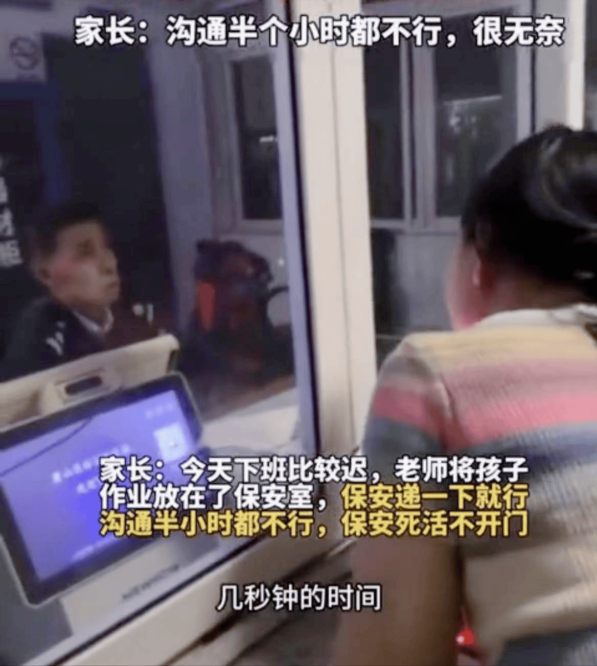 不管家長怎麼解釋,都沒有用,僵持30多分鐘,警衛就是不給開門。