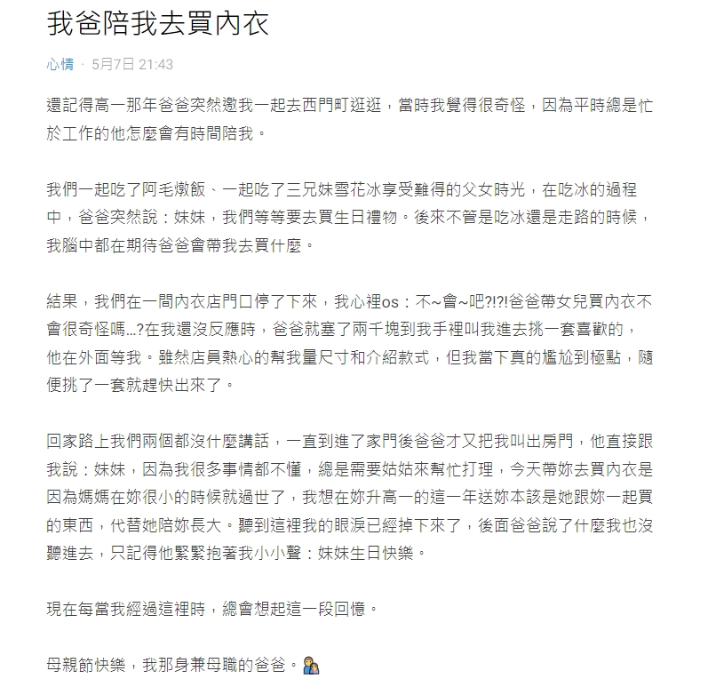 直到進了家門,爸爸才終於開口對著我說:「妹妹,因為我很多事情都不懂,總是需要姑姑來幫忙打理,今天帶妳去買內衣是因為媽媽在妳很小的時候就過世了,我想在妳升高一的這一年送妳本該是她跟妳一起買的東西,代替她陪妳長大!」這位網友還透露,湯石一聽到爸爸的心裡話,她的眼淚早已止不住,後面爸爸說了什麼也沒聽進去,只記得爸爸緊緊抱著她,並小小聲地說「生日快樂」...最後她更在文末寫下「母親節快樂,我那身兼母職的爸爸」。