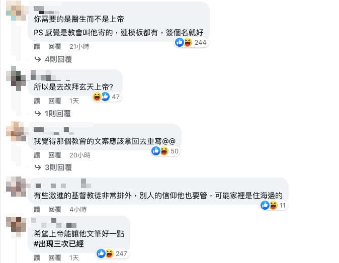 貼文曝光後,網友們的留言更是精彩。有人吐槽「你需要的是醫生而不是上帝」、「希望上帝能讓他文筆好一點,出現三次已經」,也有人調侃「就像幼稚現任要你寄給前任『我不愛你』的那種分手信」、「怕上天堂被發現擁有雙重國籍過不了海關,申請除籍」。