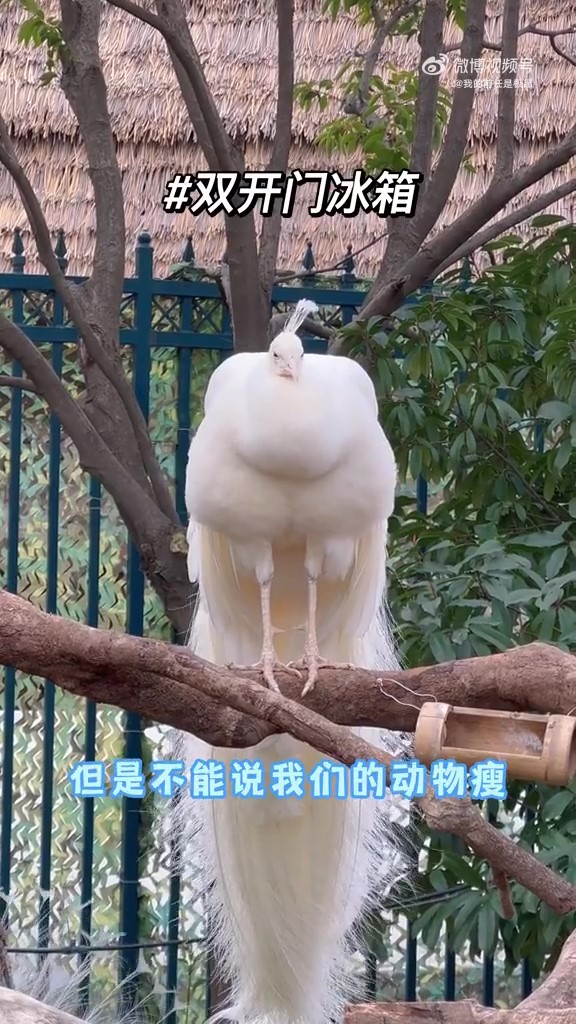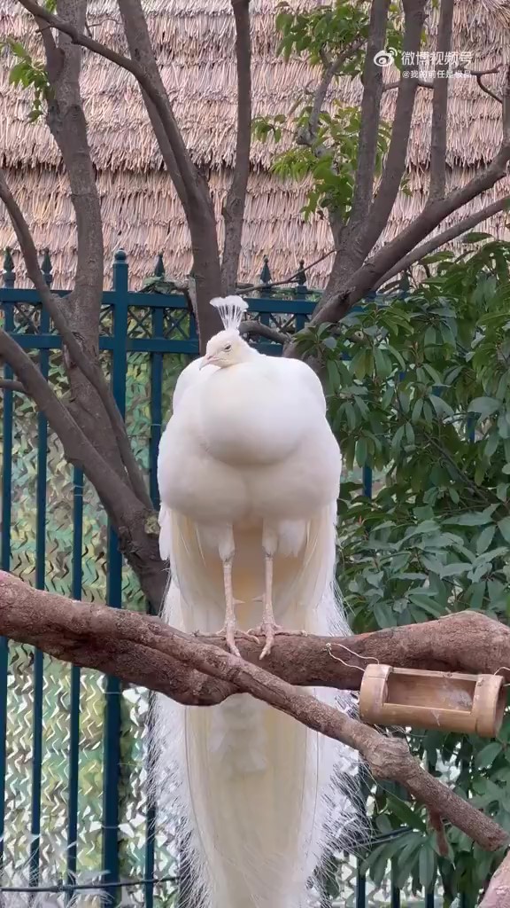 微博上有博主分享了中國河南鄭州市銀基動物王國裡的這隻稀奇白孔雀,這隻白孔雀稀奇的點不只是因為牠是罕見的純白色,還因為牠圓滾滾的身形,只見牠除了露出的頭和雙腳堪稱還是纖細的,從頭部到腿之間就像兩團白麻糬一樣,連脖子都不見了XD