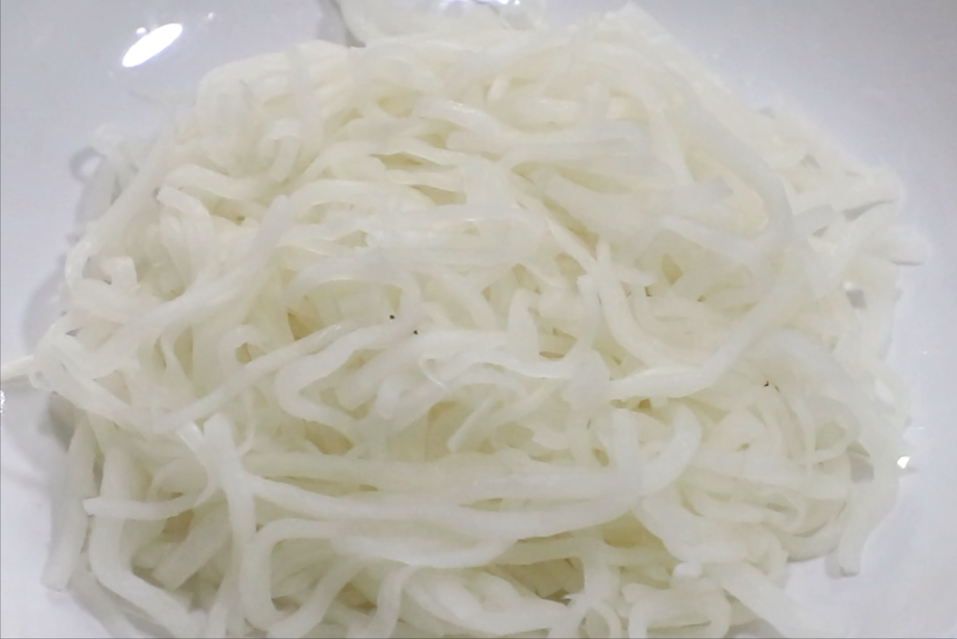 3.準備一根白蘿蔔,清洗乾淨後去皮,然後先切成薄片,再改刀切成細絲放入盆中。