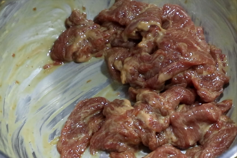 2.把切好的牛肉放入盆中,開始腌制。加入食鹽2克、雞粉1克、胡椒粉1克、白糖少許提鮮、生抽10克、料酒5克去腥、蠔油5克、老抽3克提色、香油5克抓拌均勻,把所有的料汁都打進牛肉裡面。