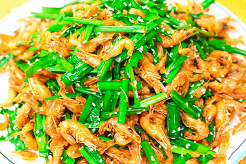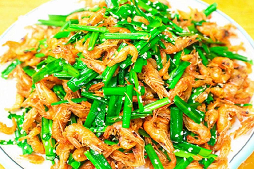 3.鍋里留底油,放入韭菜段,加入食鹽、雞粉,大火快速翻炒至斷生,然後倒入炸好的河蝦繼續翻勻,出鍋前撒上白芝麻、美味即成。
