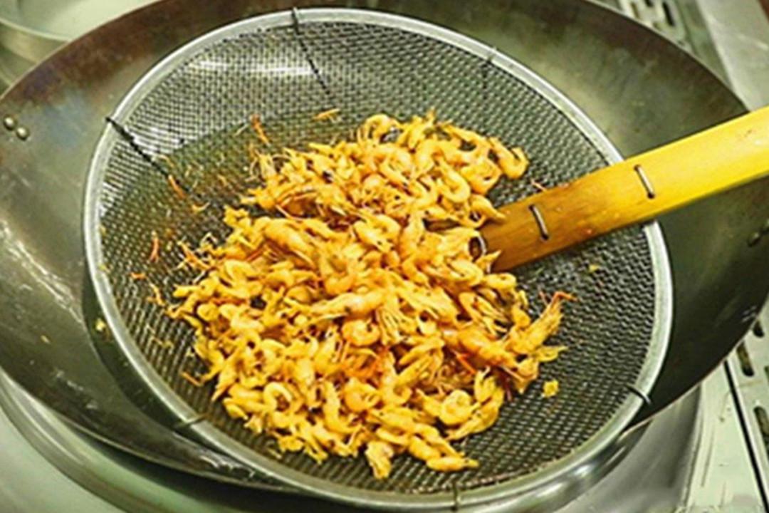 2.鍋里燒寬油,油溫四成熱時把河蝦撒入鍋中,用勺子攪攪、把粘一塊的打散,河蝦定型以後撈出來。然後升高油溫至五成熱,放入河蝦復炸一遍,吐吐油同時把蝦炸酥,一直炸至金黃焦酥撈出來控油。