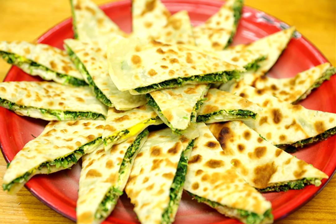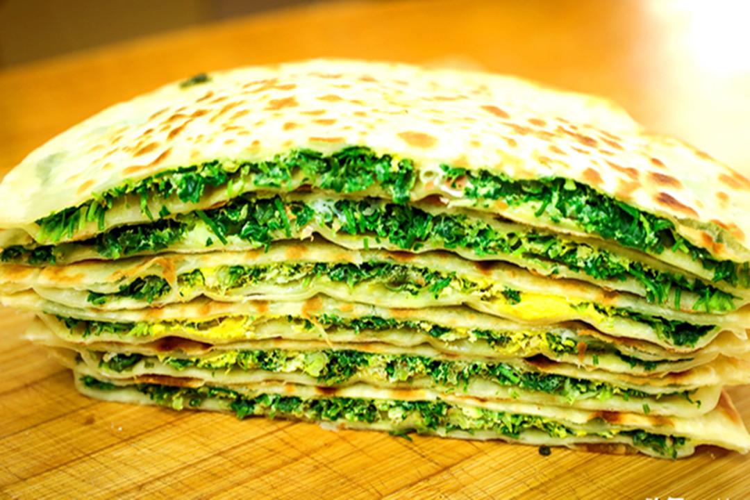 4.電餅鐺燒熱,均勻刷上油,把餅坯子往裡面一放,小火烙上兩三分鐘。時間差不多開蓋涮上油,翻個面,再烙上兩分鐘,餅鼓起來,裡面的菜就熟了,烙至餅皮金黃就能出鍋食用了。