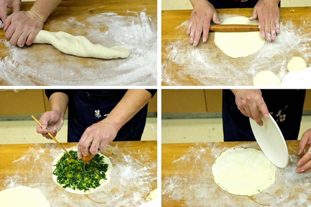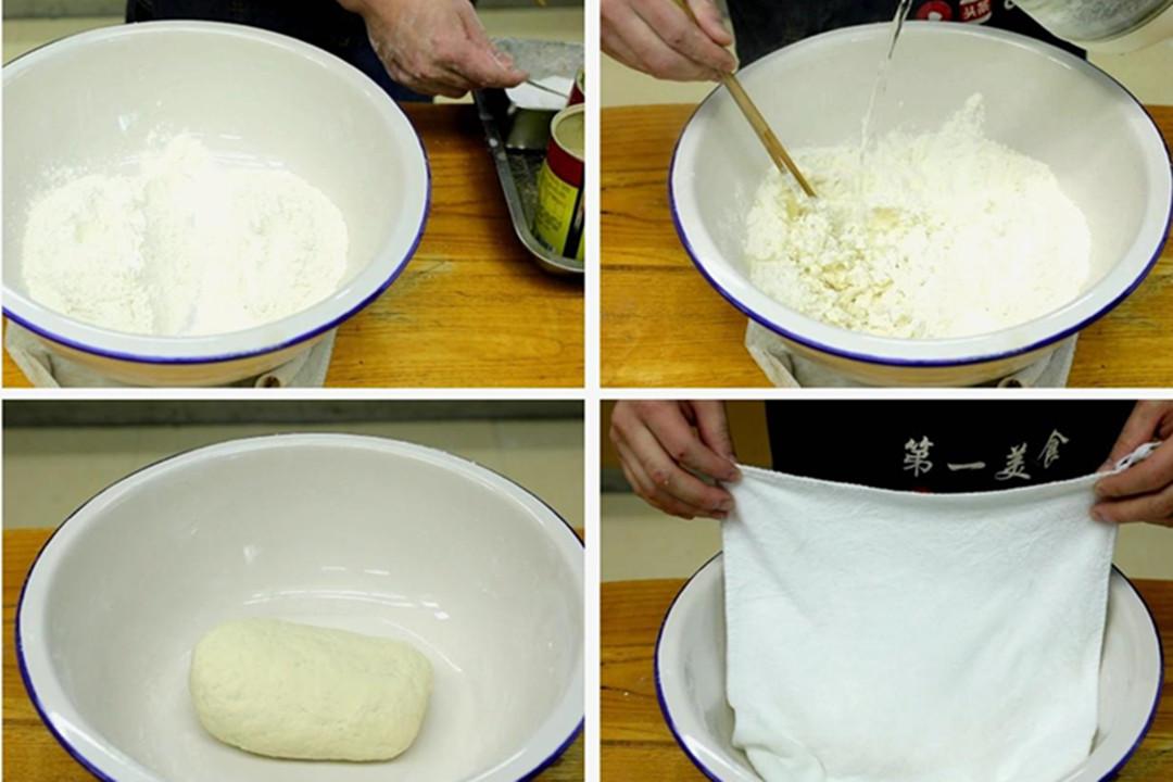 1.盆中放入500克麵粉,加入食鹽2克增加進行,一分兩半,一半用開水燙,一半用清水和,先攪成絮狀再揉成團,麵糰柔光以後蓋上餾布子,放一邊醒十來分鐘。