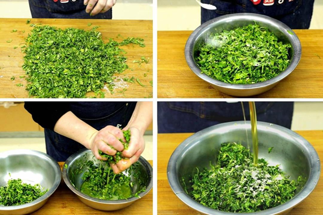 2.薺菜清洗乾淨、剁碎,多加點鹽拌勻腌一會,殺殺水去去土腥味。腌好以後擠乾水分,加入少許食鹽、多淋點油拌勻備用。