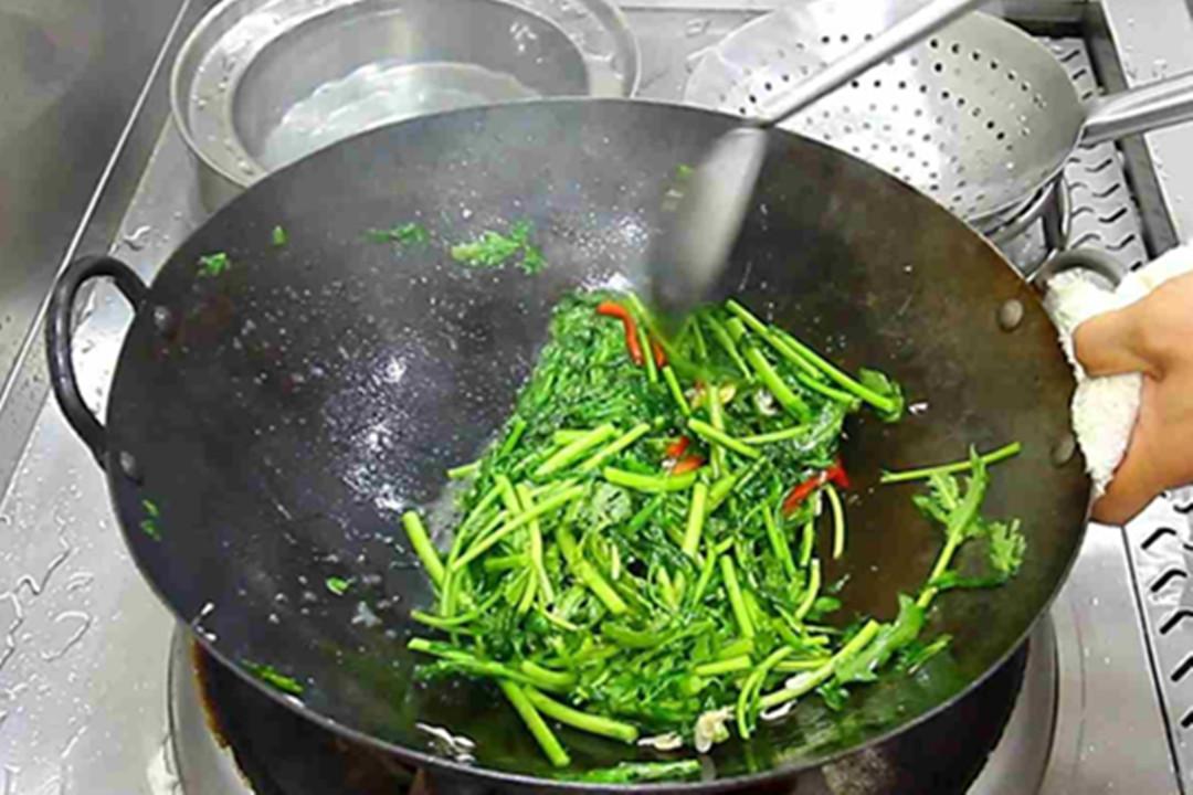 3.然後加入一勺食鹽,一勺雞粉調味,開大火迅速翻炒化開調料,茼蒿斷生以後就可以出鍋裝盤了。