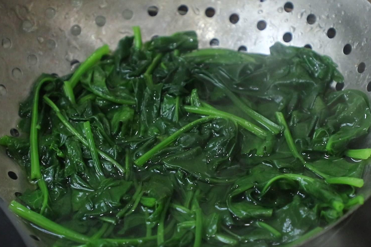 2.鍋內燒水,加入少許食鹽和植物油,讓菠菜色澤更加鮮亮,防止營養流失,水燒開以後放入洗凈的菠菜,焯水能夠減少菠菜中的草酸,菠菜斷生後倒出,用清水沖洗冷卻控水。