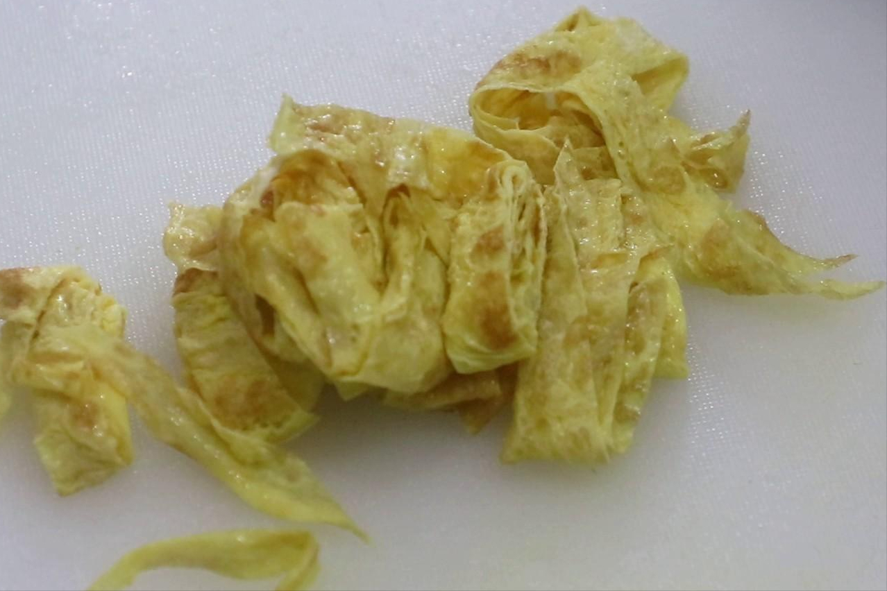 3.鍋內燒油充分滑鍋,燒熱以後倒出熱油,直接倒入一半雞蛋液輕輕轉動鍋,利用餘溫把雞蛋液鋪成圓形的雞蛋餅,定型以後沿著鍋邊淋一圈植物油。把煎好的蛋餅疊起來切成寬條備用。