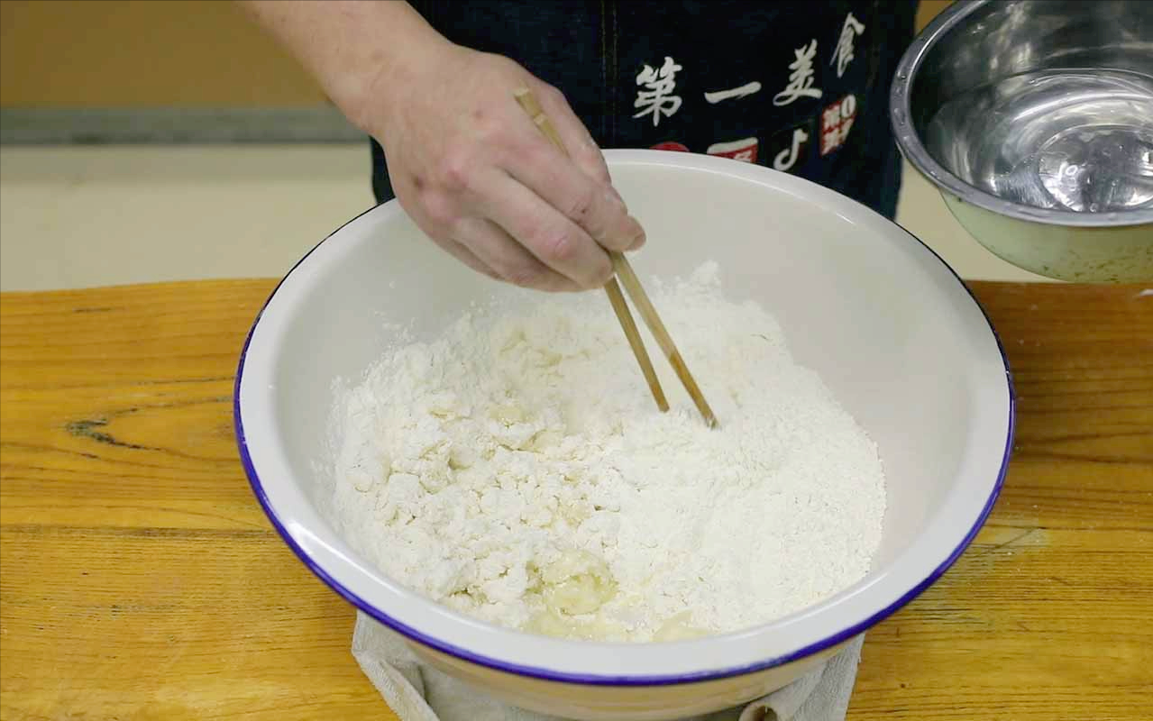1.這一平碗差不多是一斤的量,咱們中間一分兩半,撒上鹽增加筋性。一半用開水燙,一半用清水和,先攪成絮狀再揉成團。蓋上餾布子,放一邊醒十來分鐘。
