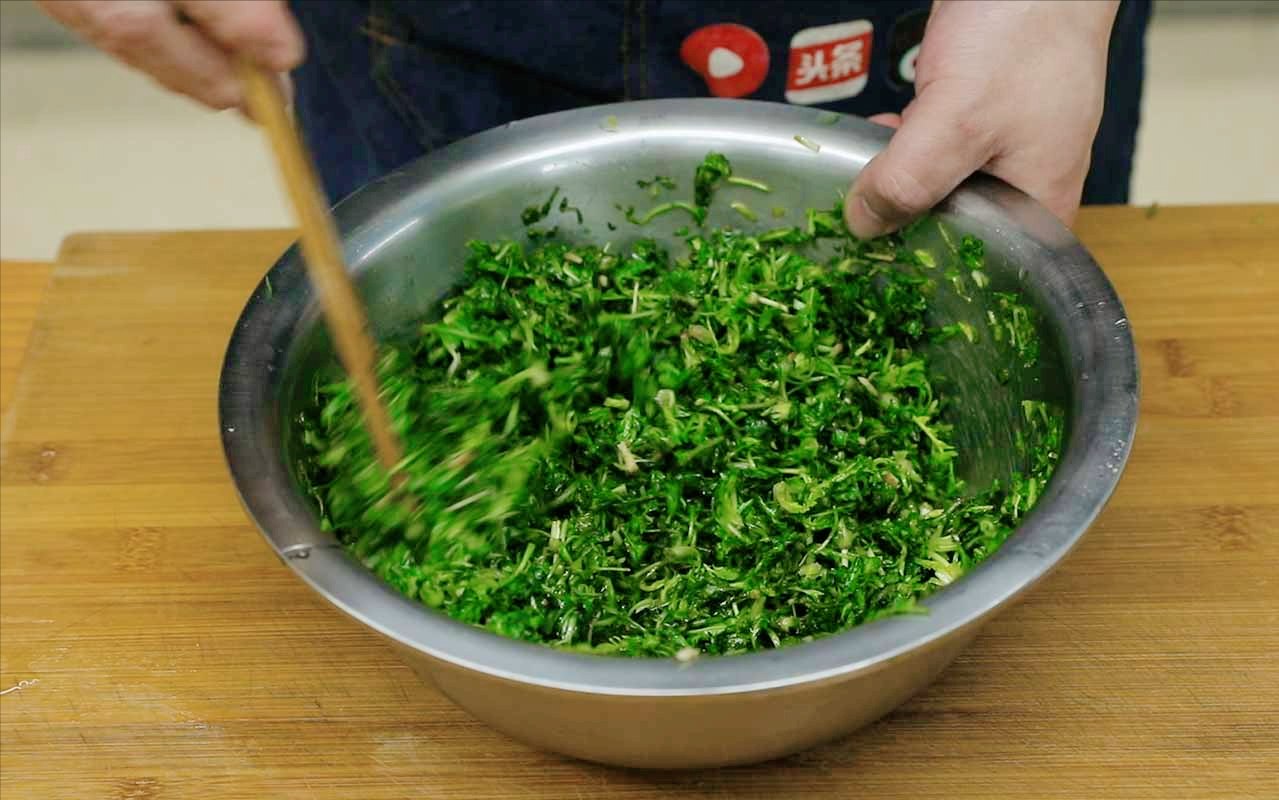 2.薺菜咱已經洗乾淨了,剁碎,多加點鹽拌勻腌一會,稍微加一點雞粉,不用再放其他調料了。再多淋點油,給它裹一層油膜。省的煎的時候再出水。