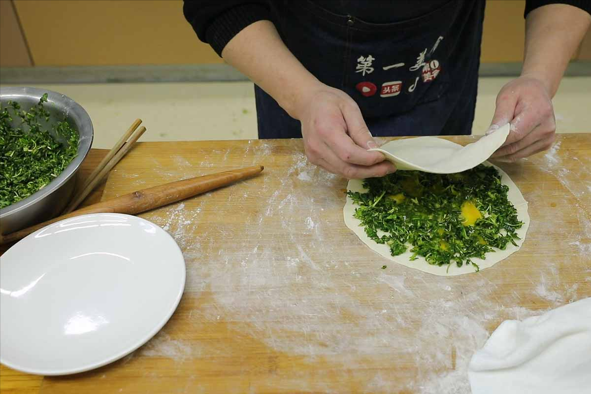3.案板上撒上麵粉,把醒好的面取出來。稍微揉幾下子,搓條,揪面劑子 ,擀麵片子,盡量中間厚兩邊薄,擀好以後鋪上一層薺菜,磕上一個母雞蛋,再拿個面片往上一蓋,用個圓盤軋一圈。