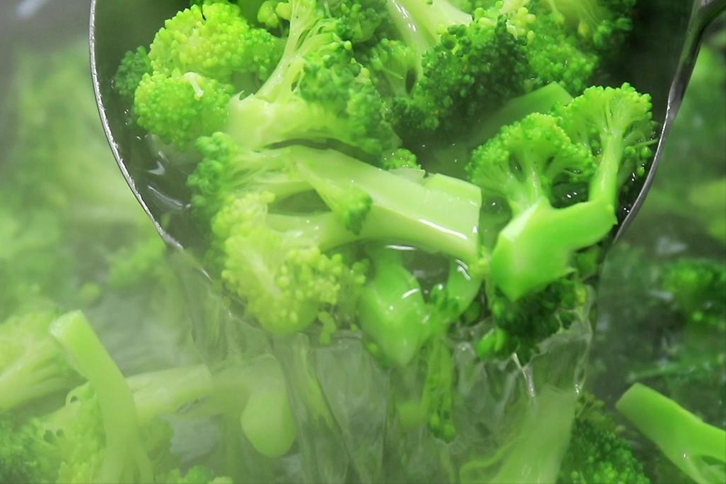 2.鍋內燒水,加入食鹽2克入底味,加入食鹽為防止維生素的流失,並且也能使西藍花色澤翠綠,放入西藍花,煮1分鐘左右,把西藍花倒出控乾水分備用。