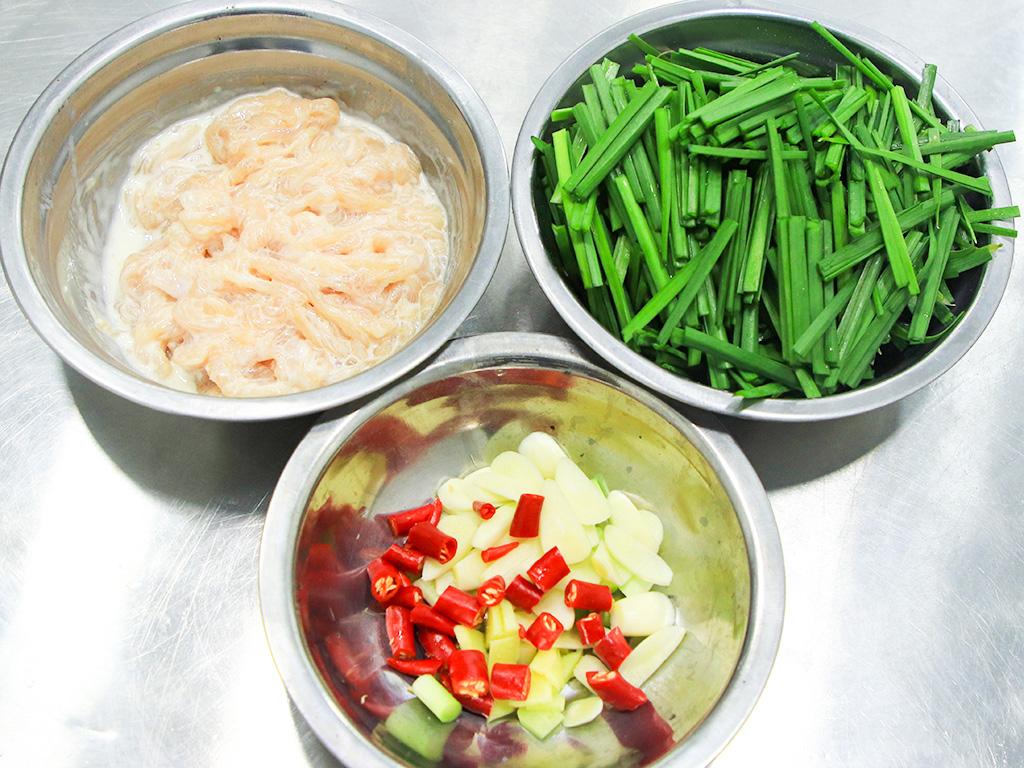 1.一把清洗乾淨的韭菜切成韭菜段;兩根蔥白切成蔥段;一塊生薑切成薑片;大蒜切成蒜片;小米椒切成辣椒圈;一塊雞胸肉切成細絲,加入一個雞蛋清、食鹽2克、料酒5克、玉米澱粉50克用筷子攪拌均勻備用。