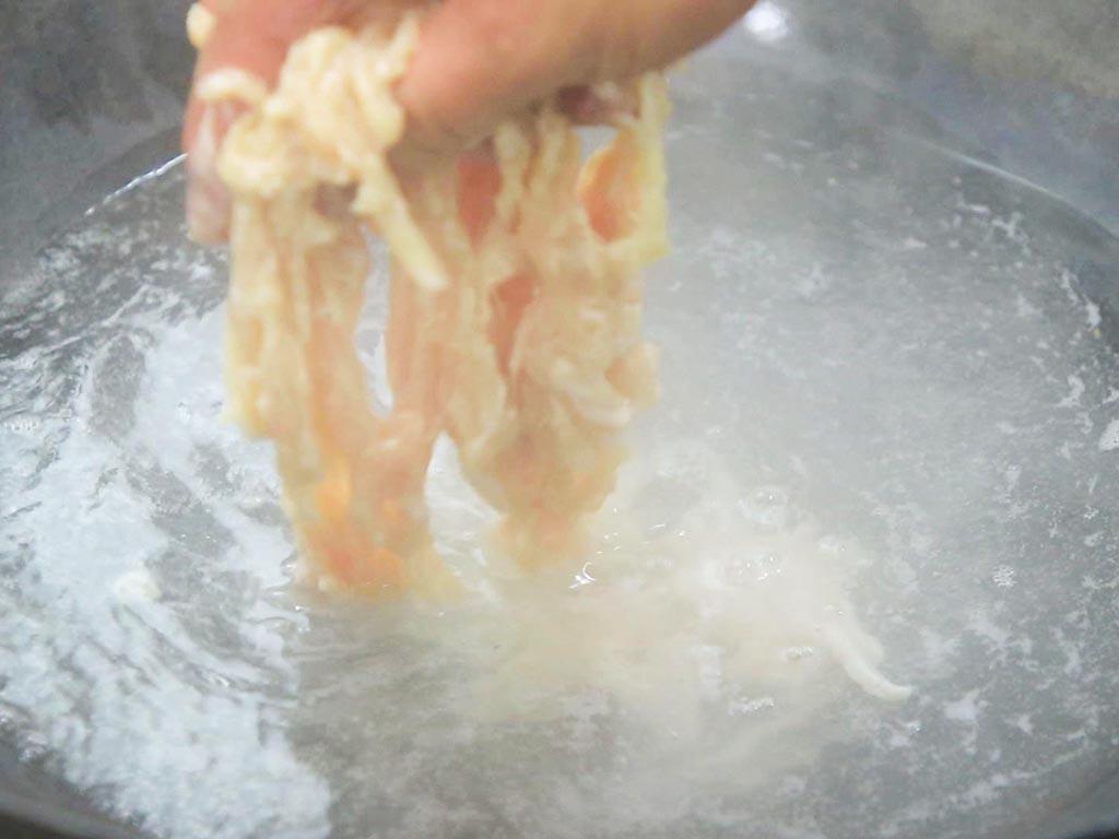 2.起鍋燒水,水開以後倒入雞絲,快速在熱水中焯燙至定型後,撈出控油備用。