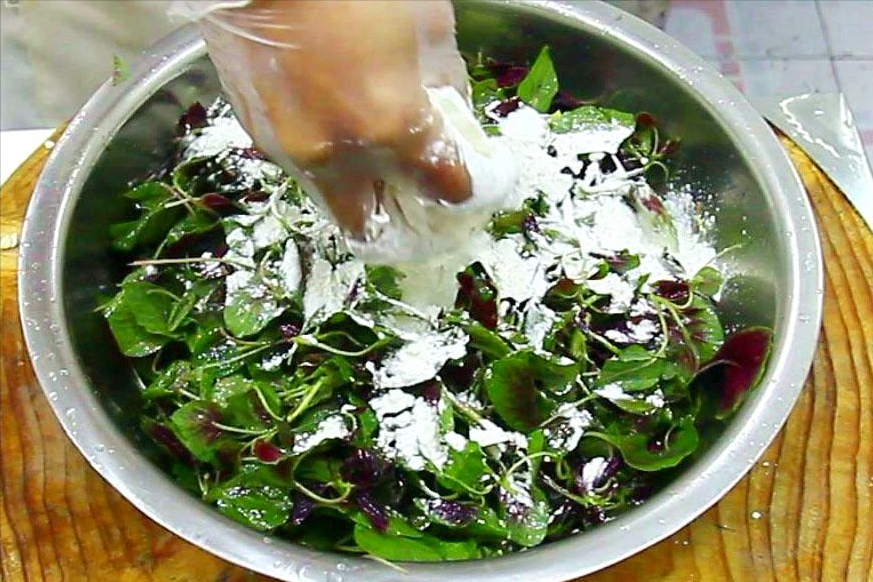 1.準備一把莧菜,摘下嫩葉,洗乾淨後控乾水分。放在盆里加入植物油,用手抓勻,然後再放入麵粉,攪拌到看不到綠葉為止。