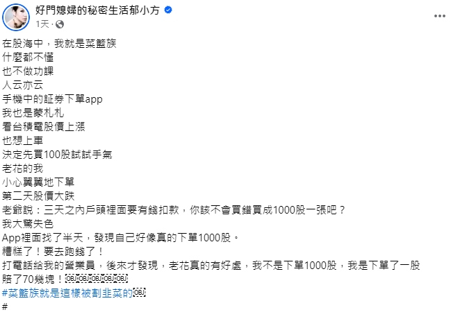 跟風買台積電!郁方手誤「買錯股」大驚失色 求救營業員:「被割韭菜了」 Elmo 2024-08-09 檢舉 還好後來聯繫營業員,還好自己的老花眼,當初要買100股,自己以為是買1000股,但實際上她只買了1股,所以最後只賠了70多元,讓她笑說老花眼根本自己的救星:「菜籃族就是這樣被割韭菜的!」太趣味了吧!資料來源:《ETtoday》 Advertisements 回首頁 2/2 Advertisements 猜你會喜歡 全身冒冷汗險昏倒!52歲郁方「驚爆躺擔架上」緊急送醫 後怕喊話「人生跑馬燈」最新病況曝光 沒錢讀書成遺憾!郁方願砸4千萬「送2兒出國深造」 看不慣住家太爽「丟包花蓮慈濟中學住校」 嘆更年期發胖!52歲郁方「成功甩肉8kg」瘦一圈 公開「能吃飽的減重菜單」關鍵要吃對 編輯精選推薦 More + 85歲失智父身亡!林葉亭突宣布「皈依佛門」 遇大師「開示一番話」忍不住淚崩 最新/賈靜雯深夜慟曝「她已離世」 淚PO合照喊:真的好愛你... 22歲愛女病逝!資深男星「走不出喪女痛」留白長髮現身 掛骨灰項鍊「代女做1事」惹淚 慶祝17歲愛女畢業!53歲大咖「兒女皆讀名校」年花千萬 驕傲「她獲三大獎」:又美又自信 24歲兒失明!于美人爆「他在飯店掃廁所」維生 不盼紅包只求「別再花我的錢」 大咖男星妹妹出嫁!全身金飾「曾獲近千萬豪宅」嫁妝豐厚 兄妹長超像「一看媽媽懂了」:基因強大 旅美多年!資深女星「堅持落葉歸根」回國5天安詳離世 死前「砸600萬做1事」眾人淚目 15歲兒「睡夢中離世」!本土女星「送愛子火化」求做1事 「PO照圓滿了」:媽媽和你永不分開 趕在40歲前閃婚!八點檔女星「宣布嫁給他」 尪驚人身分曝「媒人是柯叔元」 晚年隱居台東!68歲名主持失蹤「車內身亡」 伴侶悲曝「死前做1事」:還掛念著我 模範孝子!比莉罹癌「兒白天工作、晚上睡醫院」 坦言「一滴淚沒掉」:媽媽可以我也可以 狠斷8年婚!一線小生「被爆淨身出戶」終於離婚 認了「像被雷劈到」才會娶她 65歲男星獨居暴斃!大咖女星放下恩怨「送前夫最後一程」 昔遭動手6年嘆「死者為大」 晚年兒孫滿堂!73歲影壇大哥「拄拐杖現身」腳步蹣跚 兒子「全程攙扶不喊累」網羨:又帥又孝順 再婚2年了!43歲李燕突喊「當媽媽實在太辛苦」 認「已經有愛的結晶」:最完美的幸福❤️ 當年親吻1歲嬰!42年後「對方竟成巨星」同框劉德華 「超高顏值如兄弟」粉絲喊:真的差19歲? 功德圓滿了!台語歌后「悲曝他離世」享壽95歲 淚喊:去當快樂的神仙吧... 台語歌后慟別摯愛!告別式上認「早隱瞞病情」 道歉哭喊:原諒我簽放棄急救 相差18歲!58歲康康自爆「與老婆分房12年」驚呆眾人 提到沈玉琳「坦言罹同1病」:必須警惕... 以為只是小感冒!本土女星悲痛證實「他併發肺炎過世」 一度淚灑現場「後悔同意插管」 台灣大咖病逝「享壽83歲」!周遊告別式痛哭「認婚內出軌」:兒子很恨我... 兒子是清華碩士!遊手好閒「17年不工作」被我趕出家門 收拾房間時「發現保險櫃」打開後瞬間語塞 確診甲狀腺癌!44歲男星「術後近況曝光」哽咽:她為我祈禱 「告白演員愛妻」愛不會停止 空窗多年!68歲陳美鳳突羞認「身邊有個他」 40年前就認識「遭男方母親拆散」 離婚11年!洪榮宏愛女結婚「終破冰前妻」 「2爸爸牽她進場」催淚畫面曝