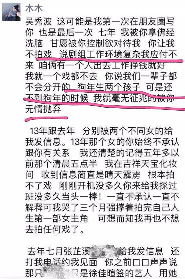 可是陳昱霖的好日子持續到了2018年就沒了,2018年陳昱霖發朋友圈控訴吳秀波,稱自己在毫無徵兆的被吳秀波無情拋棄,13年跟17年的時候她分別被不同的女人發信息騷擾。控訴吳秀波對自己不專情,還點名控訴了和吳秀波有親密關係的女明星,還稱7年之間為吳秀波付出了所有,振振有詞,不了解的人可能都以為是小女生被背叛了。