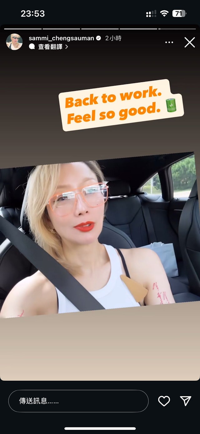 經歷這次意外,鄭秀文也感慨表示,未來一定要提醒自己別再過度勉強身體,要懂得適可而止。