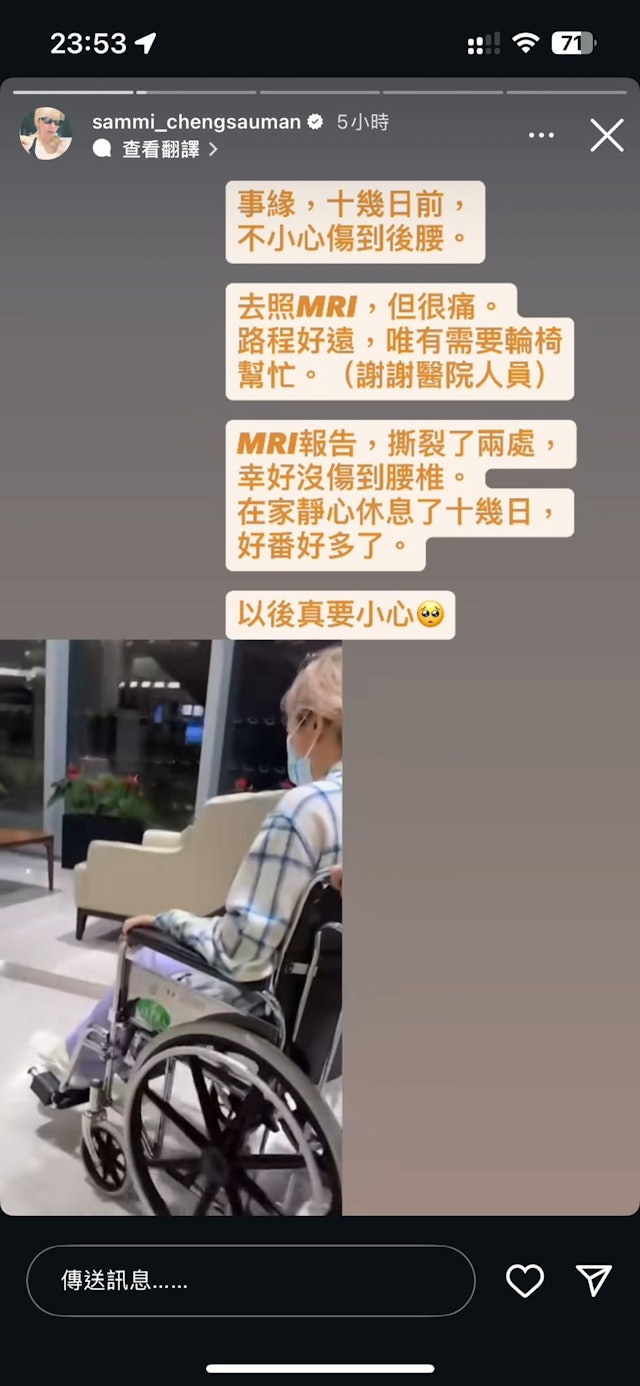 由於檢查地點距離較遠,醫護人員特別安排輪椅協助她移動。鄭秀文透露,每當輪椅經過地面凹凸不平處,震動就會引發劇烈疼痛,甚至痛到連襯衫鈕扣都無法好好扣上,可見當時情況之嚴重。