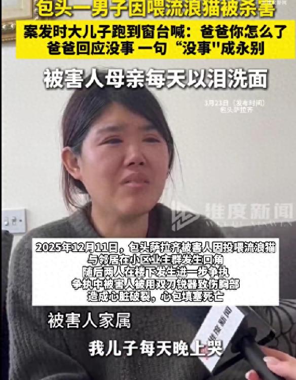 路上看到流浪貓!男子好心餵養「下一秒竟身亡」幼子目睹崩潰 喵鼻頭02 2026-04-02 檢舉 視頻載入中...2025年12月11日,包頭薩拉齊一男子因投喂流浪貓,與鄰居在小區業主群發生口角,隨後兩人在樓下發生進一步爭執,爭執中被害人被用雙刃銳器致傷胸部,造成心臟破裂,心包填塞死亡。 Advertisements 文章未完,前往下一頁繼續閱讀 下一頁 1/2 Advertisements 編輯精選推薦 More + 快訊/南投兄弟成雙屍!女兒找爸慶生「驚變忌日」 認不出是誰!55歲女星跑馬拉松「體態苗條年輕」 一抬頭「真實狀態驚呆網」:和林志玲不像同齡人... 與黃嘉千離婚2年!54歲夏克立爆睡粉「強逼女方拿掉」 如今突PO「溫馨抱嬰照」親吐孩子身份 當年搭檔徐若瑄!50歲偶像始祖「驚喜懷雙胞胎」 合照張小燕「狀態有如少女」 情史不輸女兒!張柏芝媽媽「16歲時未婚先孕」 55歲出道「當三級片女星」原因看哭網友 台灣知名銀行「599億賣掉了」!退出台股股市 徒手爬101惹議!知名大咖「挑戰爬62樓」畫面曝光 剛做完3動作「下秒墜樓身亡」 北檢續追5大案!柯文哲「最快入獄時間」曝光 規模遠超311!專家示警「2大震源區」是未爆彈 恐掀9.3強震「導致20萬人死亡」 3姐妹照顧重病母!媽走後「房子遺產全給弟弟」她兩手空空 祭拜百日「都擲不到茭」網嘆:下輩子別再見 驚現「死亡凶兆」!命理師預言:柯文哲「這年前難脫身」重生時間曝光 震撼演藝圈!30歲女星癱軟「身體不適求救」 救護員「伸狼爪還拍照」監視器全錄下場慘了 打不完!美國提15點「終戰方案」 伊朗怒斥太過分:「不切實際」 「鄭習會」4月7號登場!他揭「中共3大要求」:斷了國民黨的路 快訊/薛仕凌慘了!遭求處重刑「檢怒斥狡猾惡劣」 相信柯文哲是清白的嗎?民調結果「一面倒」令人震驚 快訊/知名台灣大廠「股票恐成壁紙」!最嚴重恐下市 台灣知名老街沒落?店家「7點全關門」客感嘆:失去靈魂 網曝殘酷原因 又爆新戀情!74歲王文洋「交往20歲女大生」 女方「清秀長相曝光」已見家人 快訊/飛機驚傳「撞山墜毀」全數罹難! 快訊/台中市長初選「結果出爐」!姐弟之爭落幕 全球「最安全航空」2026榜單曝!台灣這航空「奪下第8名」唯一擠進前十 發現3歲女童走失! 17歲智能障礙生「一路背去警察局」:我怕有壞人拐她走 最新/3度中風送醫!資深男星爆離婚「斷50年髮妻」 「砸1億淨身出戶」家族爆紛爭 王力宏也來了!孔子第76代孫「無預警宣布結婚」 新娘絕美現身「身份驚呆網友」:門當戶對
