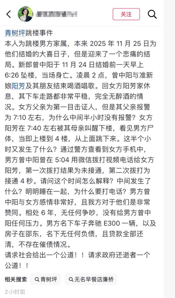 11月26日,一位網友的發文引發網友關注,據其發聲得知,她是男方的姐姐,原本11月25日是弟弟結婚的大喜日子,結果迎來了一個悲痛結局,新郎曾中陽於婚禮前一天早上6點26分墜亡。