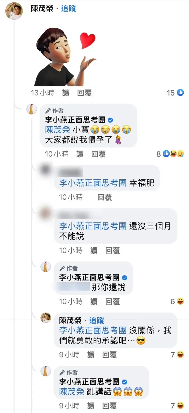 沒想到網友除了祝福她「七夕情人節快樂」外,卻有不少網友歪樓,注意到李燕的穿著寬鬆、肚皮幅度也很可疑,立刻吸引大批網友討論:「懷孕了嗎?恭喜」、「肚子好像有寶寶」、「感覺好像好像懷孕,三個月不能說」,而陳茂榮也在留言處笑說:「沒關係,我們就勇敢的承認吧...」讓李燕嚇到趕緊澄清:「亂講話!」